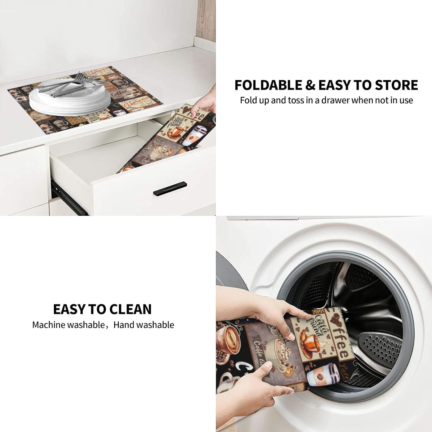 - Easy To Clean & Store -- The Drying Mat Is Machine Washable, Easy To Clean And Store. Fold And Slip Into A Drawer Or Cabinet When Not In Use. The Mat Can Also Be Hung On The Hook With The Tape