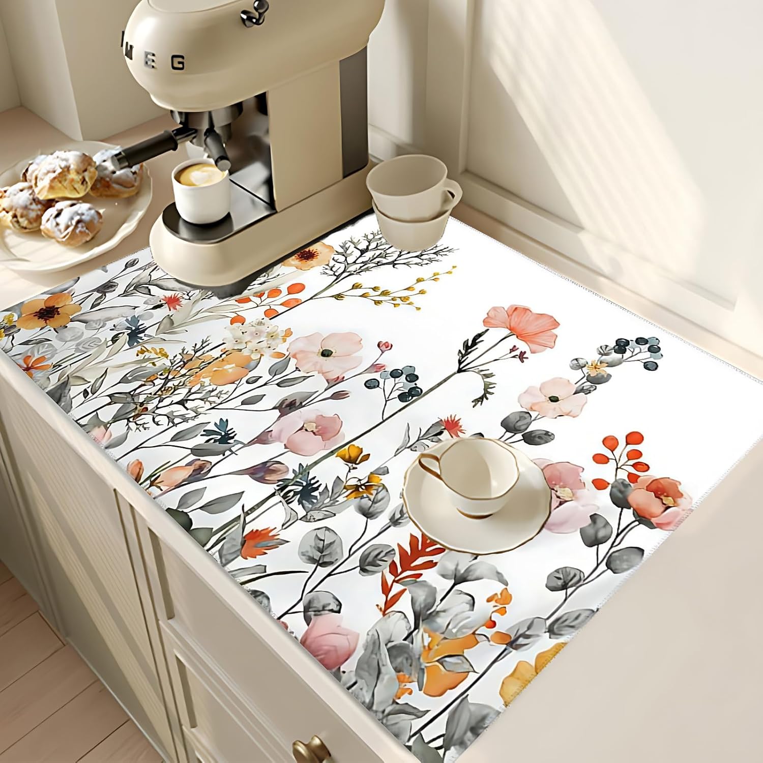 2Pcs Dish Drying Mats Faucet Mats Sets Large Size Coffee Mats Sink Faucet Mat Splash Guard for Kitchen Counter Bathroom Sink Coffee Bar Kitchen Decor (Colorful Wildflowers, 18"x24" 15" x 5.5"Set)
