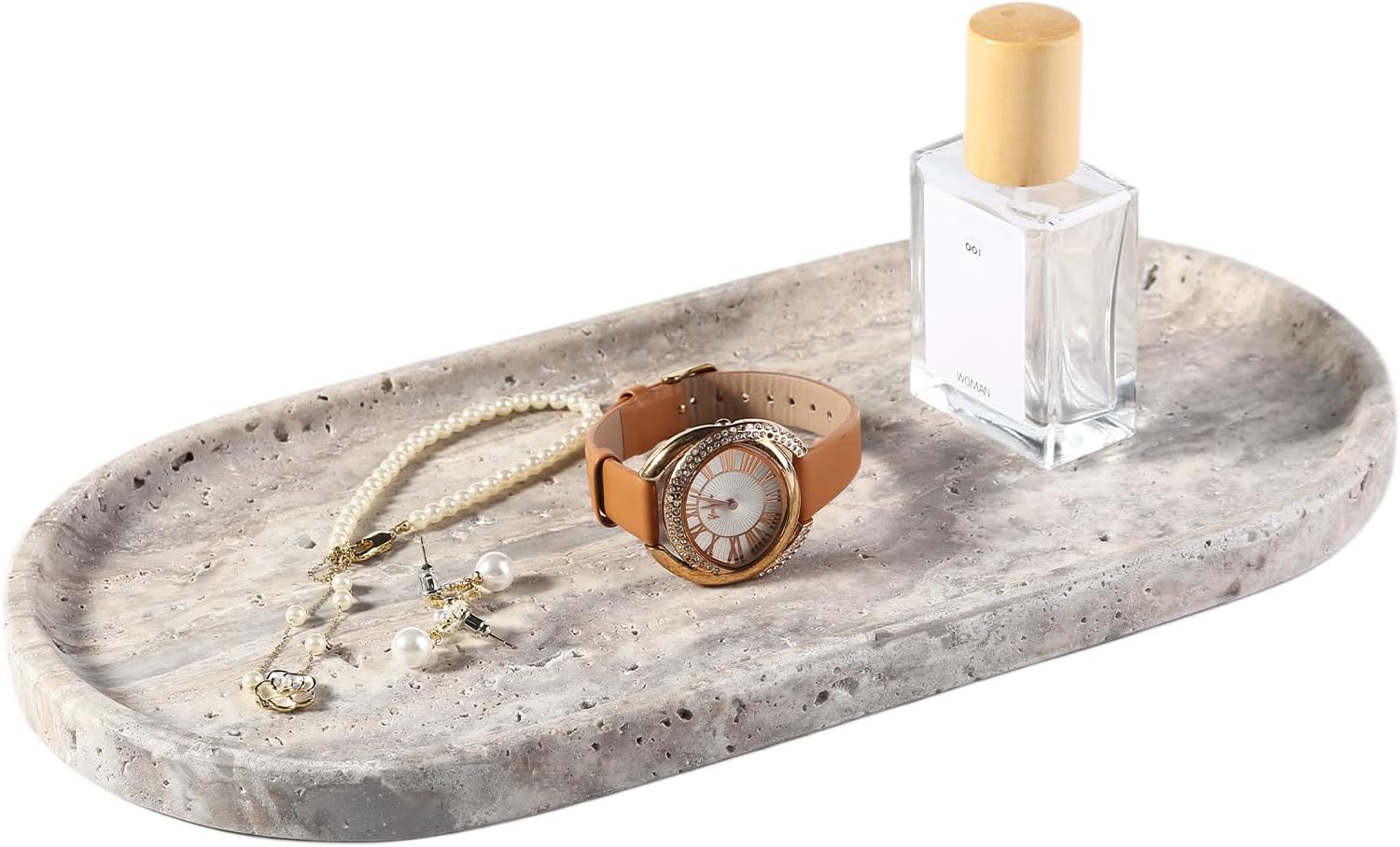 Koville Natural Travertine Tray for Bathroom Countertop, 12"x6" Vanity Decorative Marble Tray for Perfume, Candles, Jewelry, Stone Catchall Trays Jewelry Dish, Silver Stone Trays for Kitchen Counter