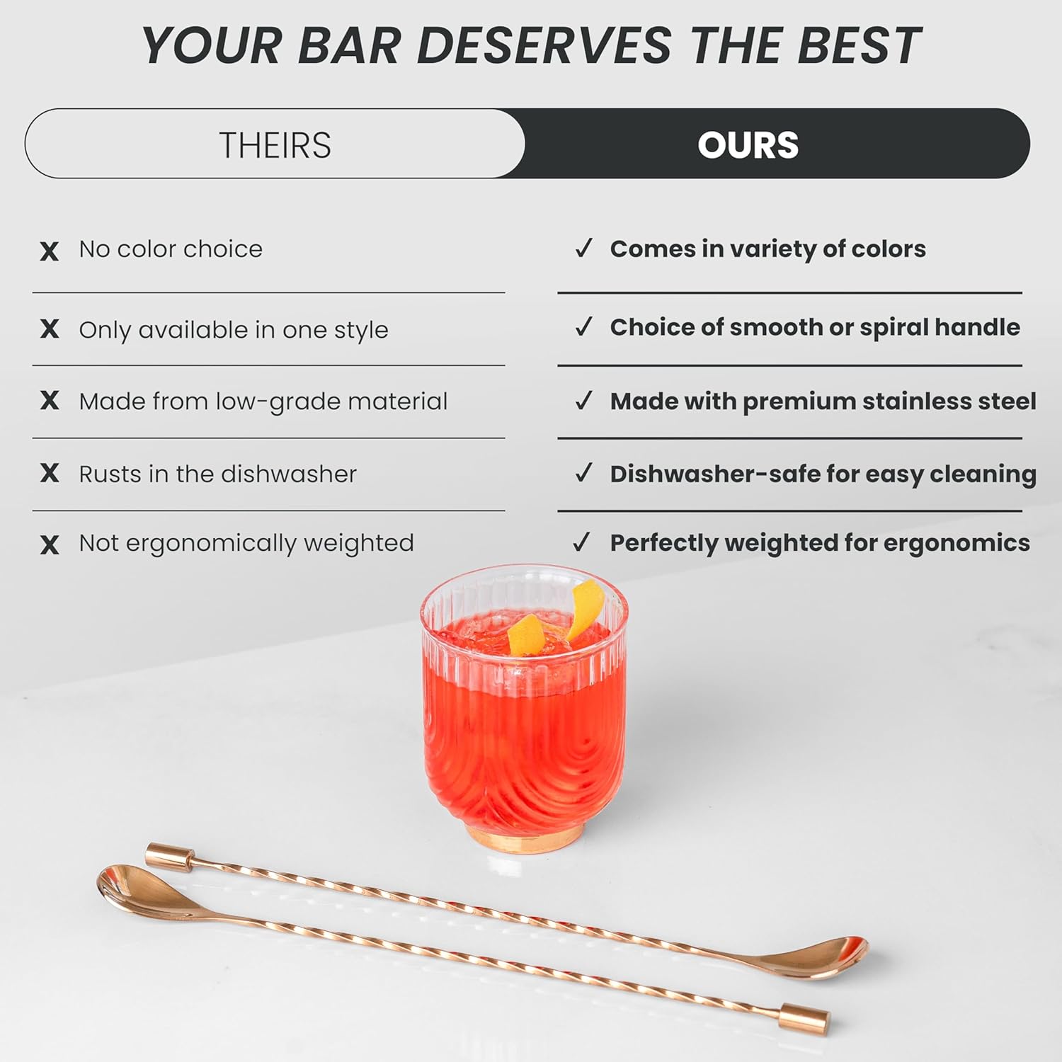 - STAINLESS STEEL STIRRERS FOR PRECISION MIXING: Designed by a career bartender, this 12-inch drink spoon set includes one spiral and one smooth handle for versatile stirring. Made for speed, accuracy, and balance, the ergonomic shape feels natural in the hand, making this the go-to tool for mixing cocktails in a shaker, mixing glass, or pint.