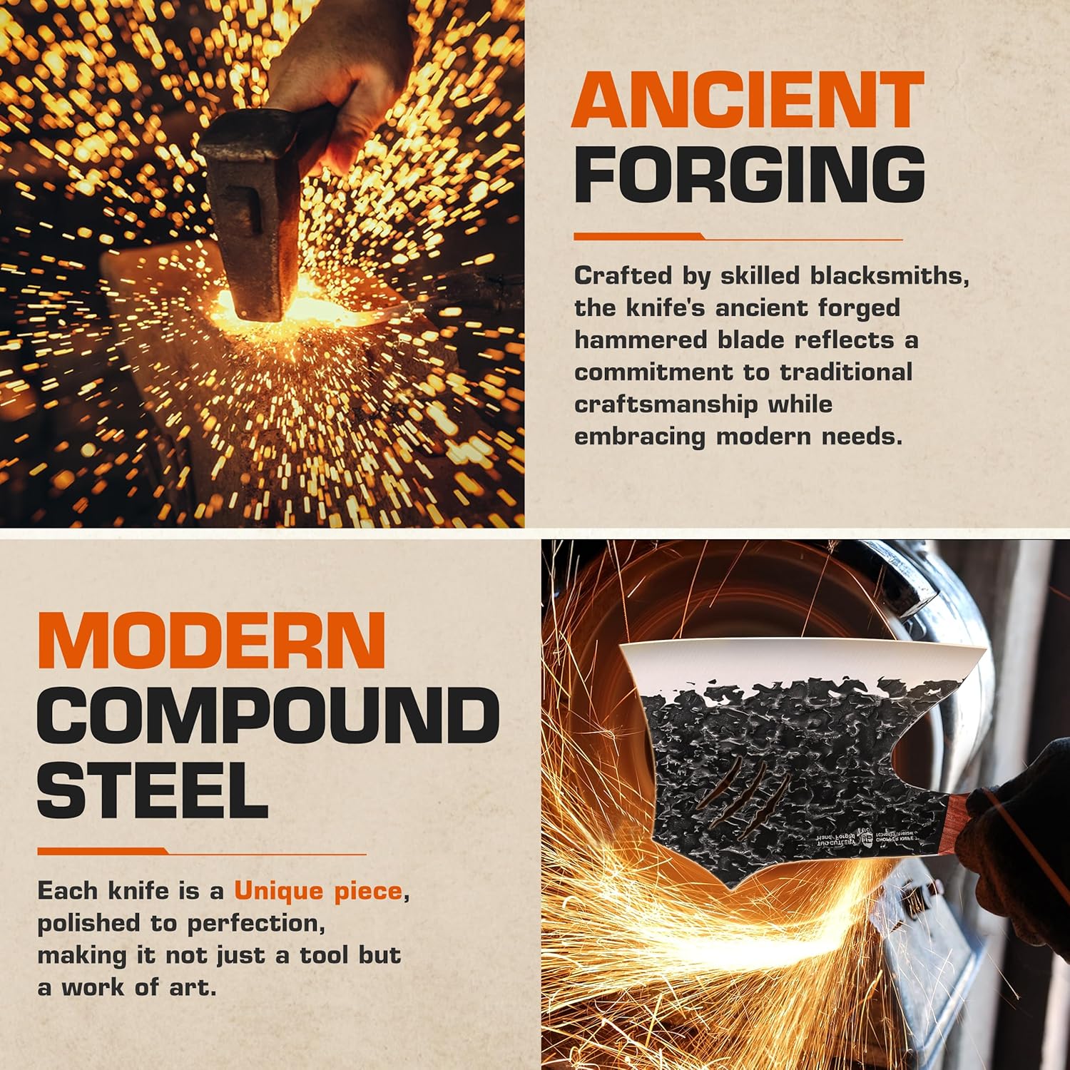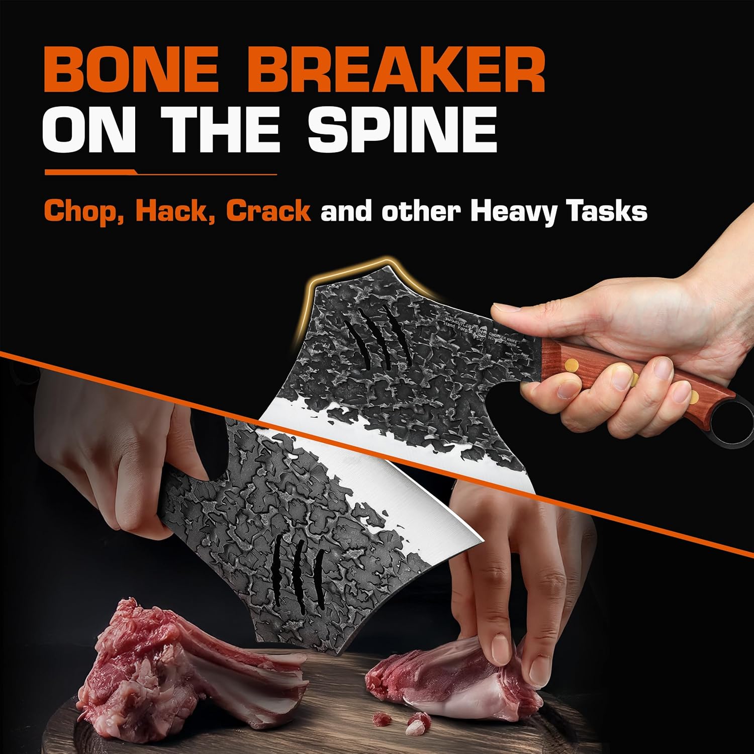 - 【Wild Craftsmanship】Thickened 4mm hammered blade with rugged spine and tapered edge. This axe type bone knife delivers optimal splitting force for heavy-duty chopping through pork ribs, and disjointing beef shanks.