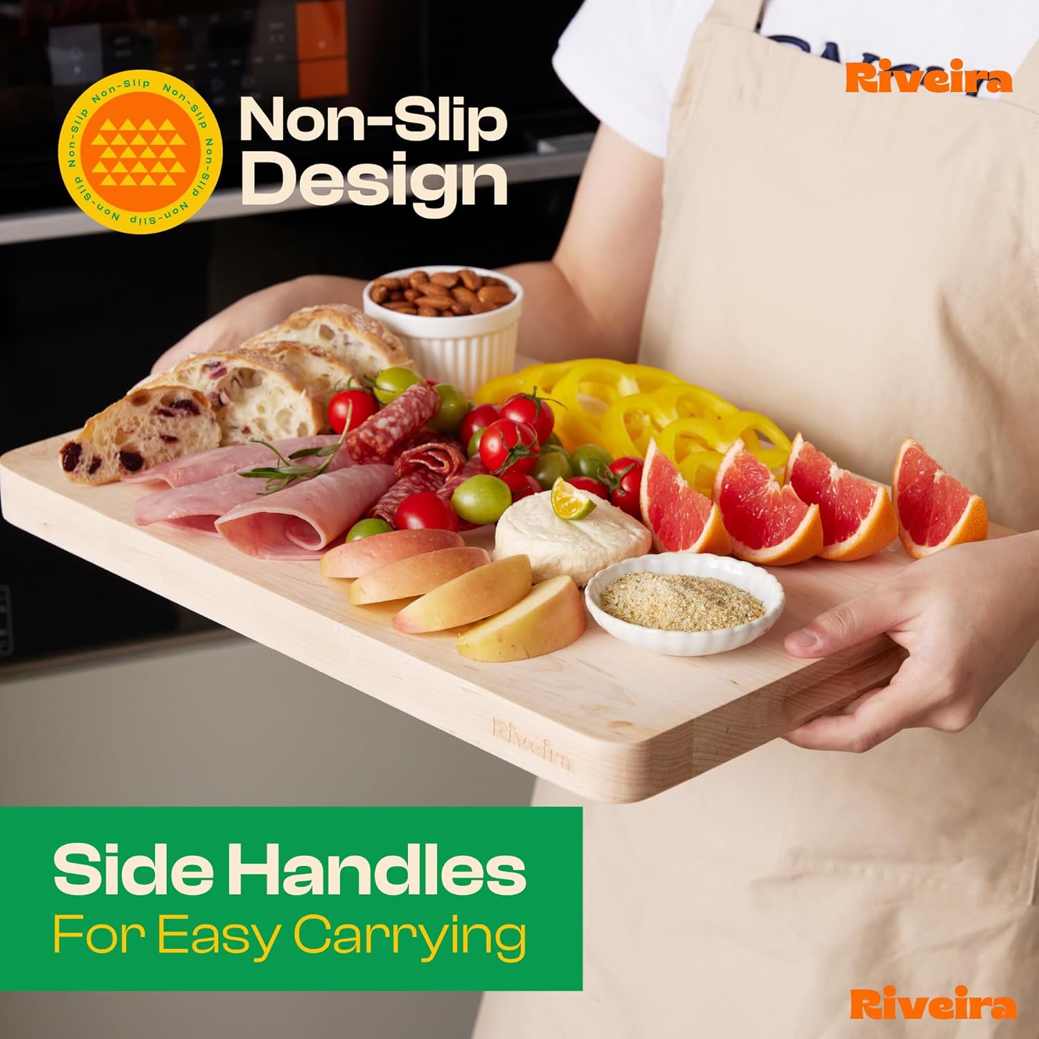- No Mess Cutting and Transfer — Enjoy a mess-free kitchen with our maple cutting board set. Equipped with deep juice grooves, these maple wood cutting boards for kitchen catch liquid runoff from meat, fruit, and other ingredients, preventing spills and countertop messes. Whether you're working in an industrial restaurant kitchen or your home, this cutting board maple makes cleanup a breeze. Transfer ingredients from your prep station without any fuss with Riveira maple cutting boards.