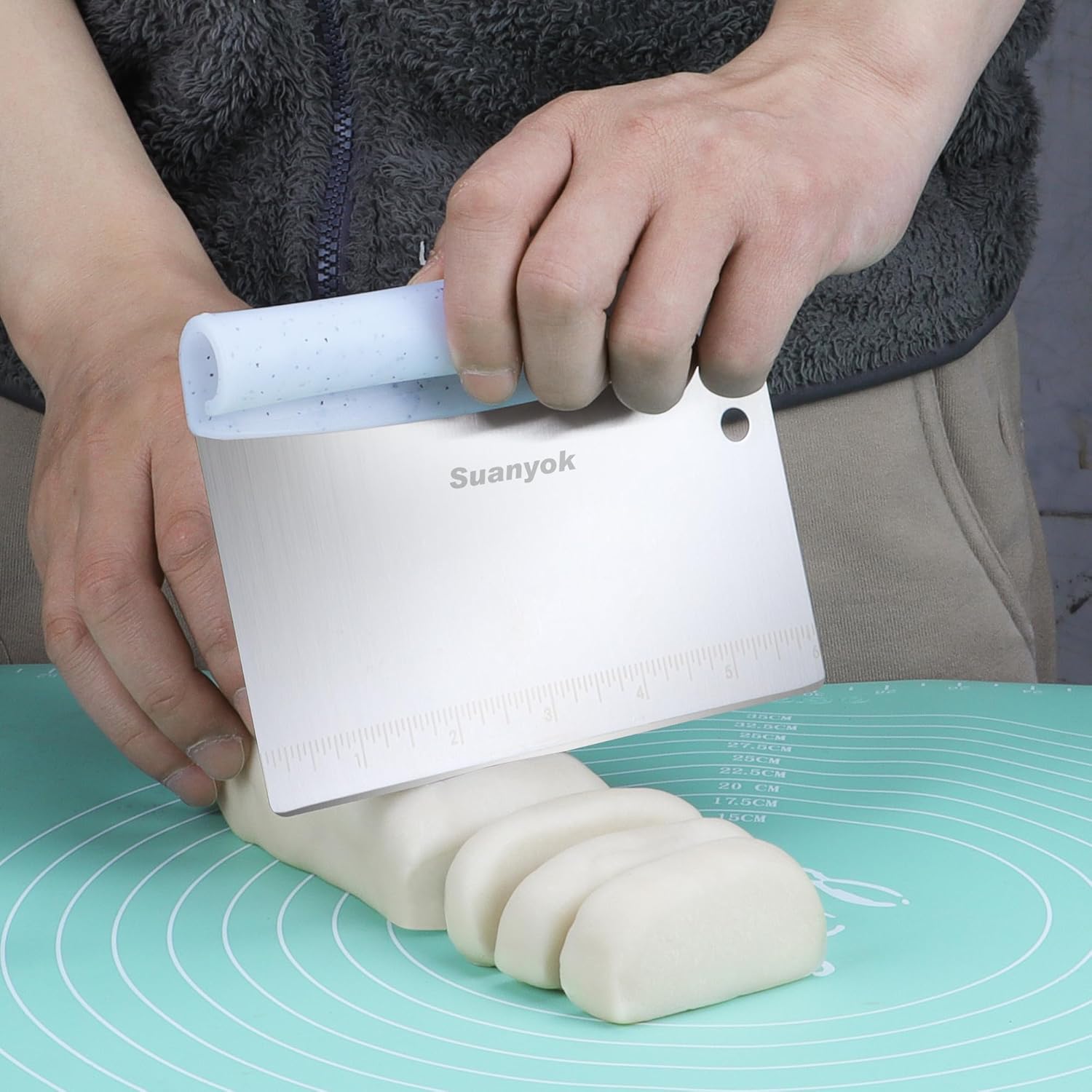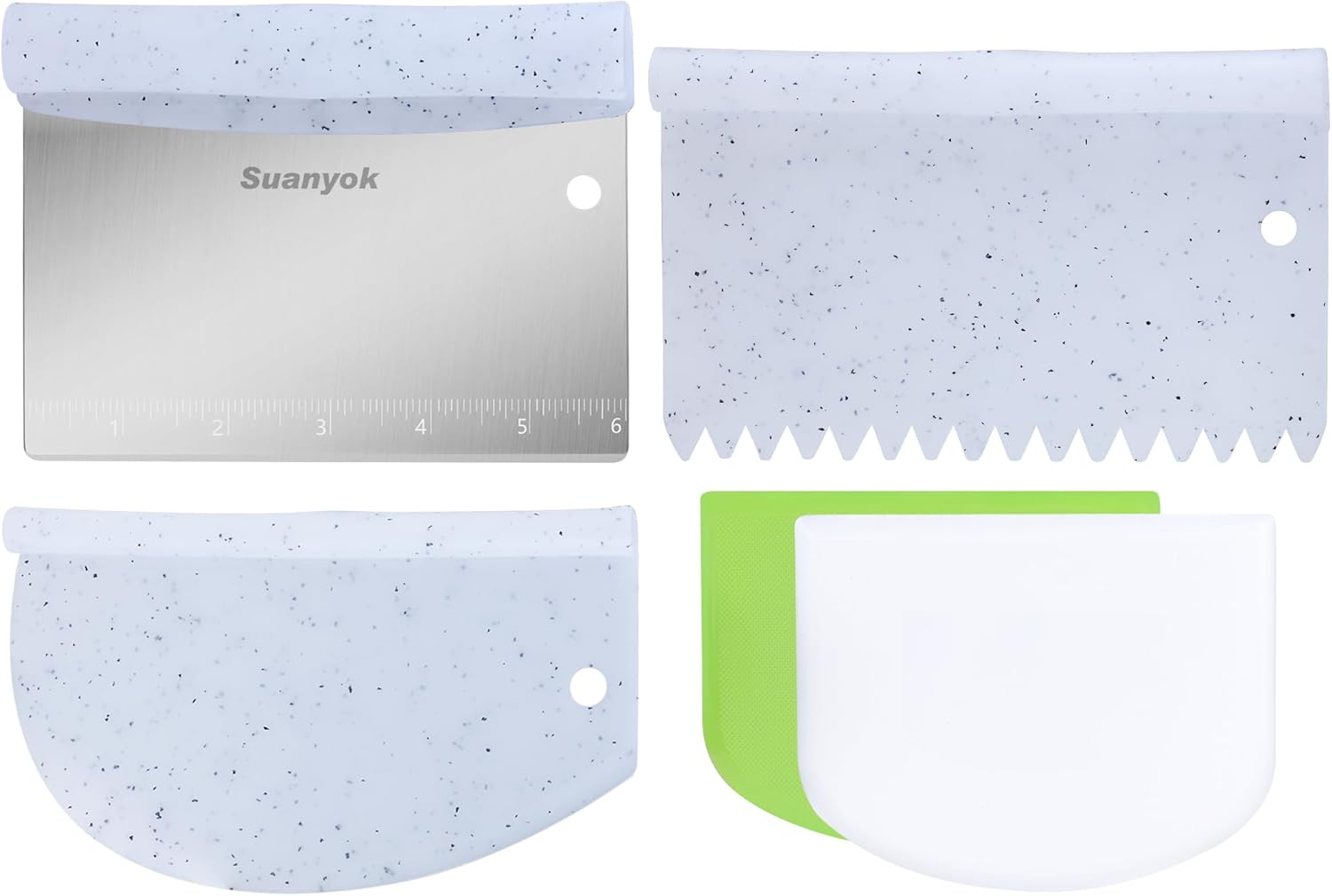 - DOUGH SCRAPER: more than just a bench scraper. It can also be cut into dough and made into pastry/pizza/spaghetti/bread and biscuits. Smooths the icing/cream on the cake, divide the butter into small pieces etc! 5-piece dough scraper, which can be used to cut various foods- you have always wanted this bench scraper, you just don't know it