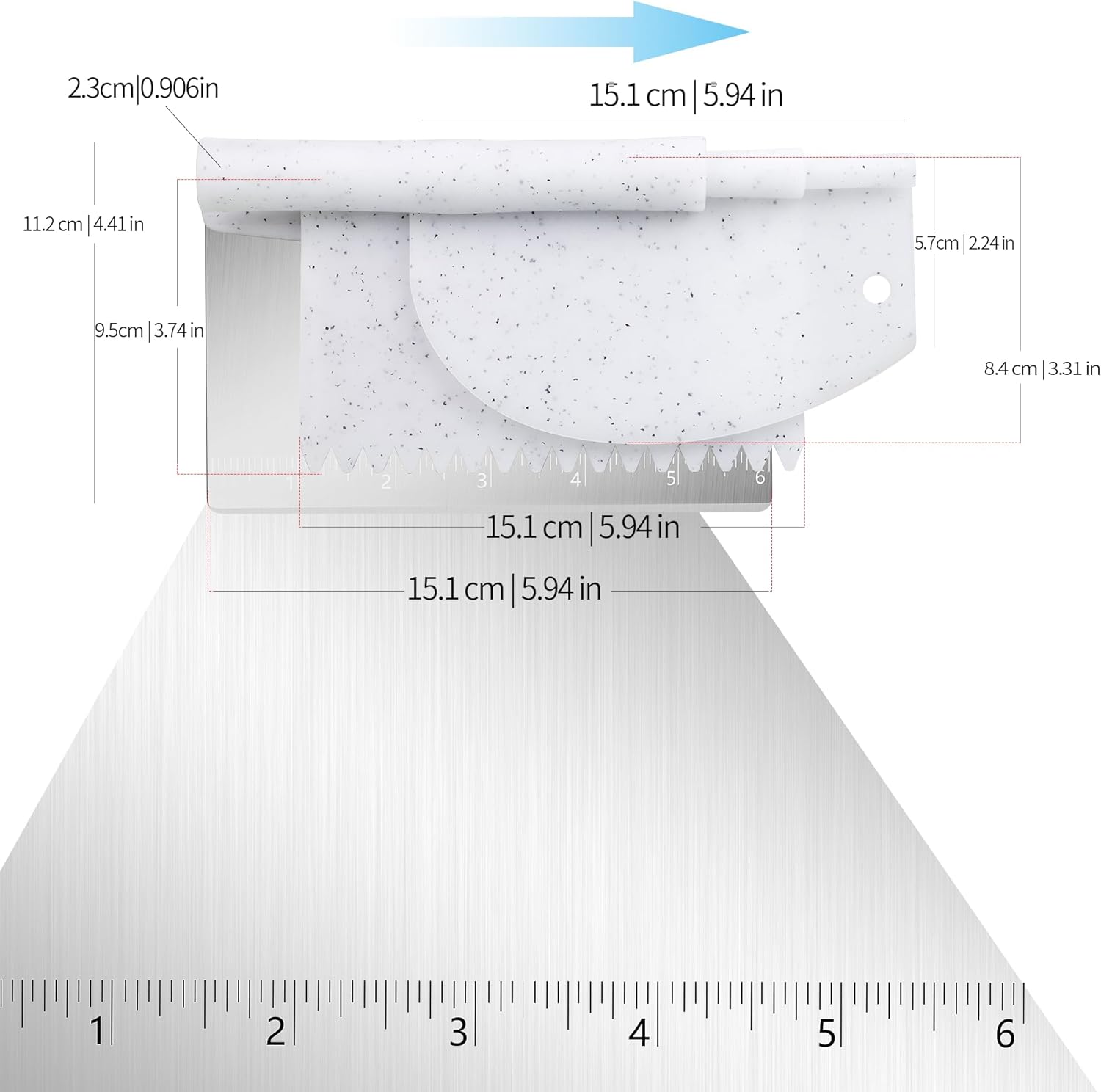 - STAINLESS STEEL BENCH SCRAPER: equipped with 430 stainless steel safety bevels blades specially designed for dough.With the clearly engraved measurement conversion table, you can quickly reference and mark up to 6 inches at any time- Precise dough cutting and dispensing is easier than ever