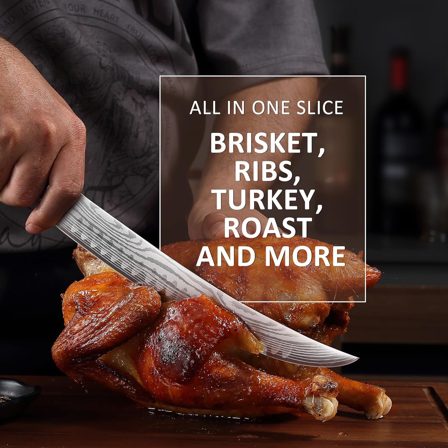 - Razor-Sharp Edge: Precision-forged at 56+ Rockwell hardness and hand-polished for unmatched sharpness, this slicing knife ensures clean, precise cuts through meat, bones, and cartilage from beef, pork, poultry, and more.