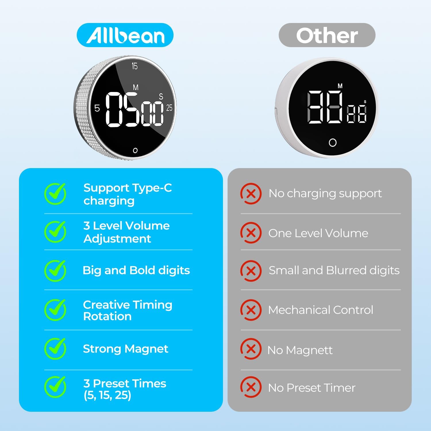 - 【Save about 30 dry cells per year】With Type-C charging, building 800mAh rechargeable battery offers at least a month's battery life on a single charge. Allbean Visual timer has full year quality guarantee and detailed instructions manual.