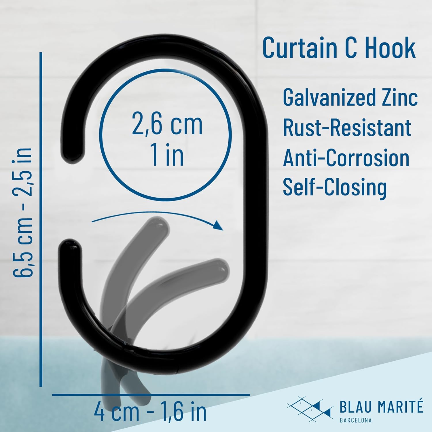 12 Metal Shower Curtain Hooks, Rust-Proof Decorative C-Shaped Curtain Hooks for Bathroom, Black Shower Curtain Rings, Fits Rods Up to 1 Inch (C, Black)