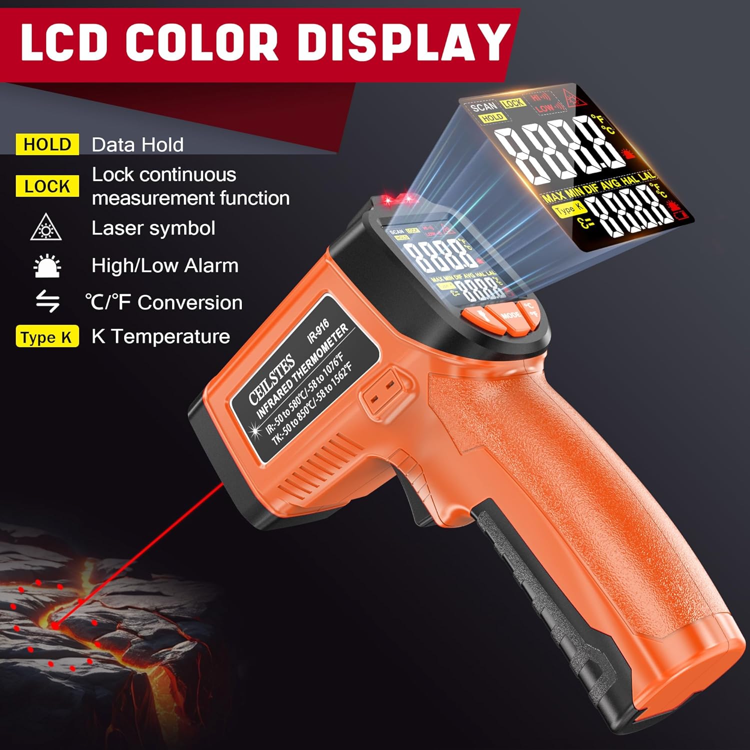 - HIGH TEMPERATURE RANGE: The Infrared Thermometer Gun is subjected to rigorous and precise calibration tests. Press the gun trigger to accurately measure the temperature anywhere in the range of -58℉ to 1076 ℉ (-50°C to 580℃). Accuracy: +/-2.0%. Response time: <0.5s.