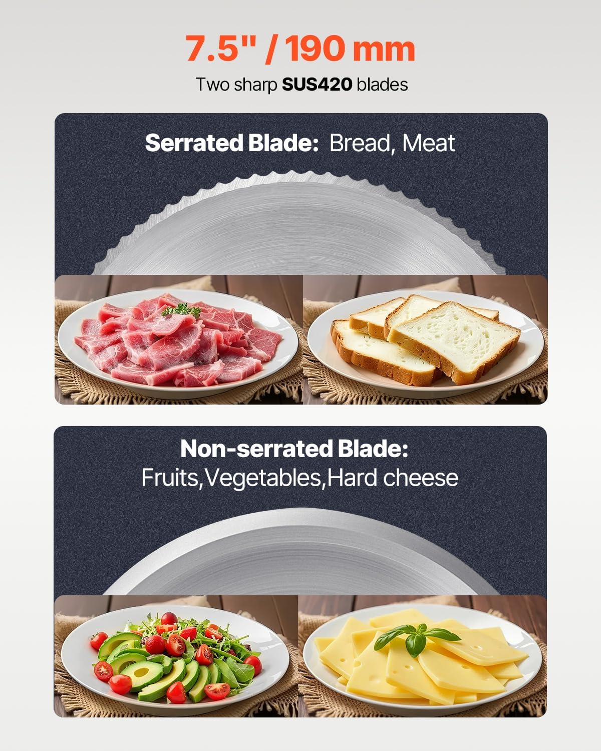 - 7.5" Stainless Steel Blades: Our meat slicer is equipped with upgraded 7.5" wide SUS420 stainless steel blades, effortlessly handling various food textures such as frozen meat, cheese, ham, and bread.