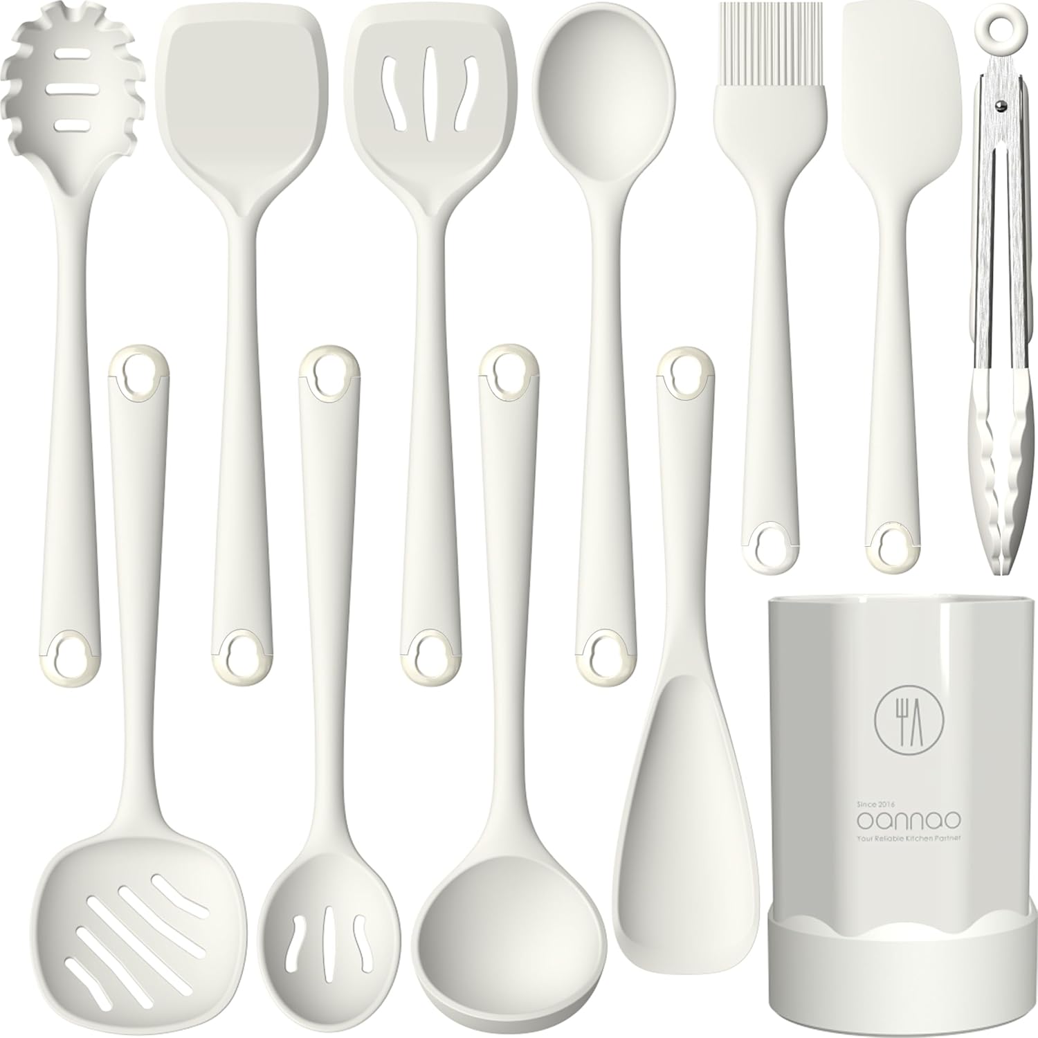 - VERSATILE KITCHEN UTENSILS SET: This silicone cooking utensils includes deep soup ladle, pasta fork, spoonula, slotted spoon, tongs, turners, brush, and holder, covering various daily cooking needs, an essential for new homes and apartments
