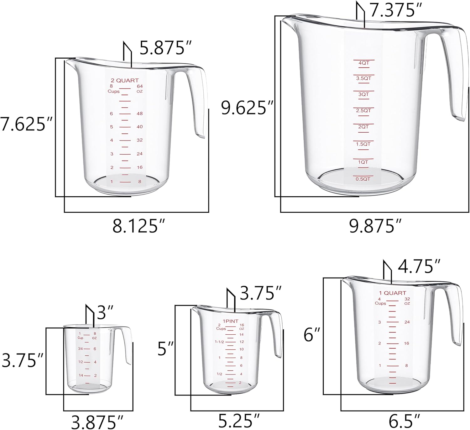 - EASY-TO-READ & PRECISE MARKINGS: Clear measuring cup set bold high-contrast markings in both cups, ounces, and milliliters ensure quick, accurate measuring at a glance—no squinting! Available in 1/2/4/8/16 cup sizes to cover all your measuring needs