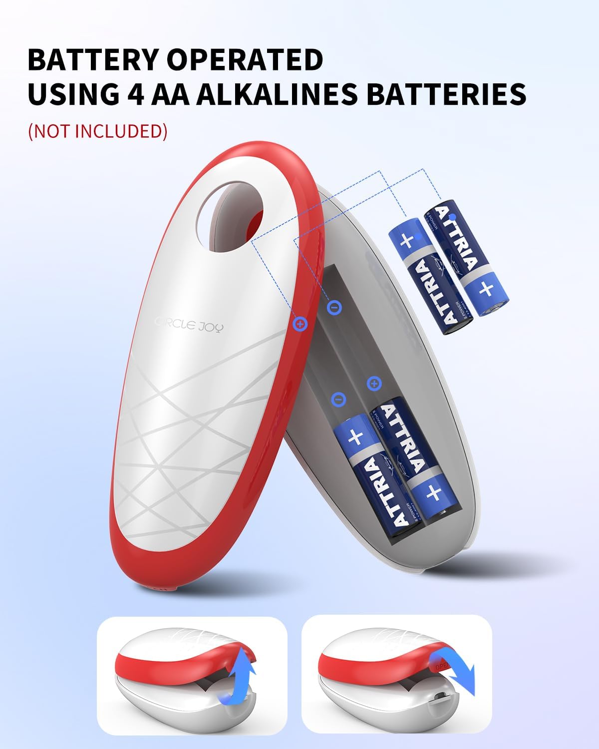 - Powerful Battery Operated - This can opener electric requires 4 AA batteries (not included) to provide powerful performance. It can easily open all types of cans without effort. (Not suitable for pull-tab or soda cans.) The opening process usually takes 30-40 seconds, depending on the size and material of the cans.