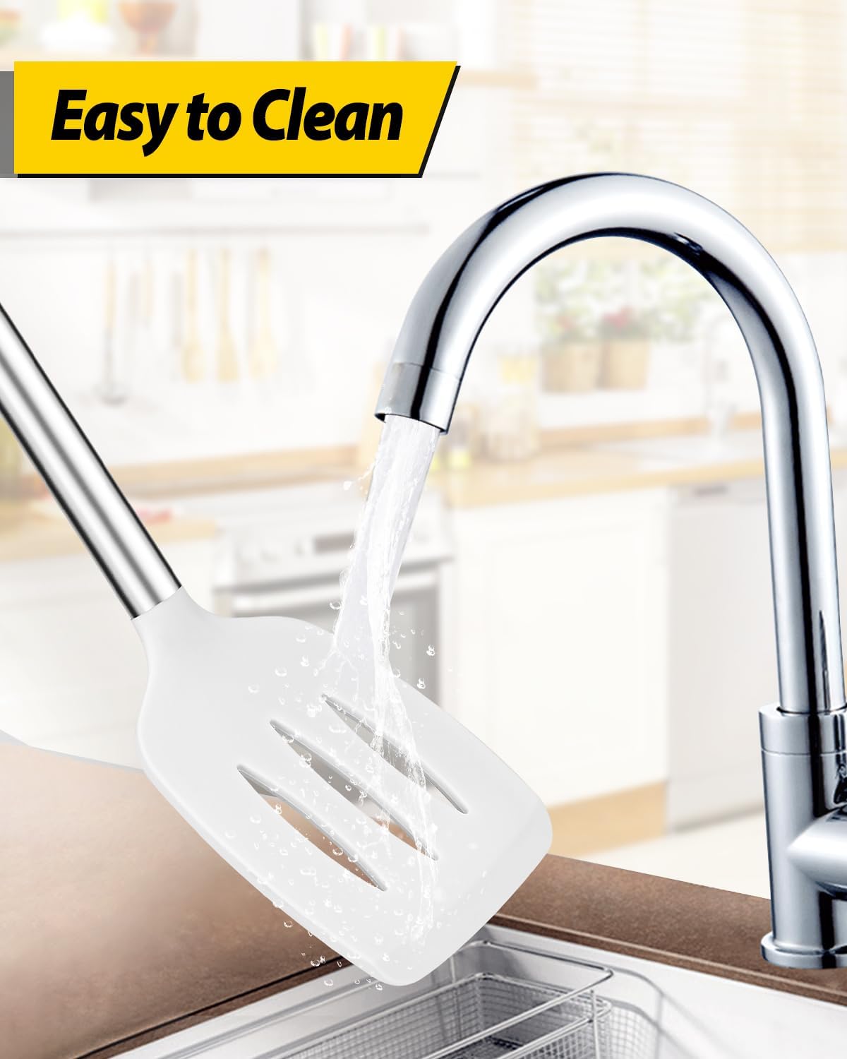 Pack of 4 Silicone Cooking Utensils Set, Non Stick Large Solid Spatulas, Heat Resistant Slotted Spoons, Ideal BPA Free Kitchen Turners for Frying, Mixing,Serving,Draining,Turning,Stirring (WHITE)
