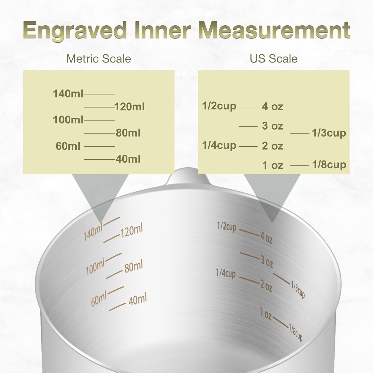 - Dual Scales Available - Engraved clear and accurate METRIC & US scales on the inner side will never fade and can be seen forever. It can meet different needs and let you know the amount to add in every time. The all measurement contains 2/3cup, 1/2cup(4oz), 1/3cup, 3oz, 1/4cup(2oz), 1/8cuo(1oz), 160ml, 140ml, 120ml, 100ml, 80ml, 60ml, 40ml