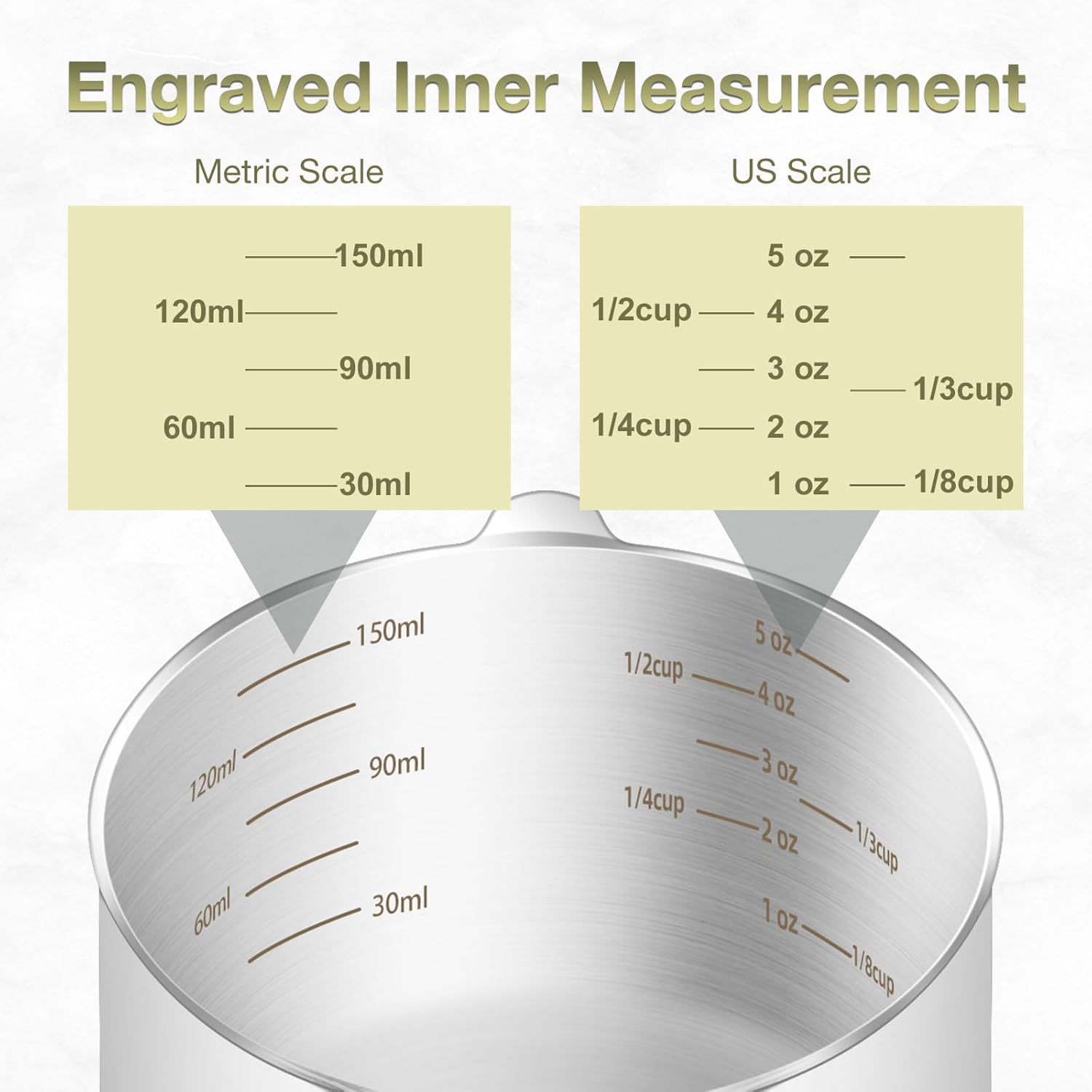 - Dual Scales Available - Engraved clear and accurate METRIC & US scales on the inner side will never fade and can be seen forever. It can meet different needs and let you know the amount to add in every time. The all measurement contains 3/4cup(6oz), 5oz, 1/2cup(4oz), 3oz,1/3cup, 1/4cup(2oz), 1/8cup(1oz), 180ml, 150ml, 120ml, 90ml, 60ml, 30ml