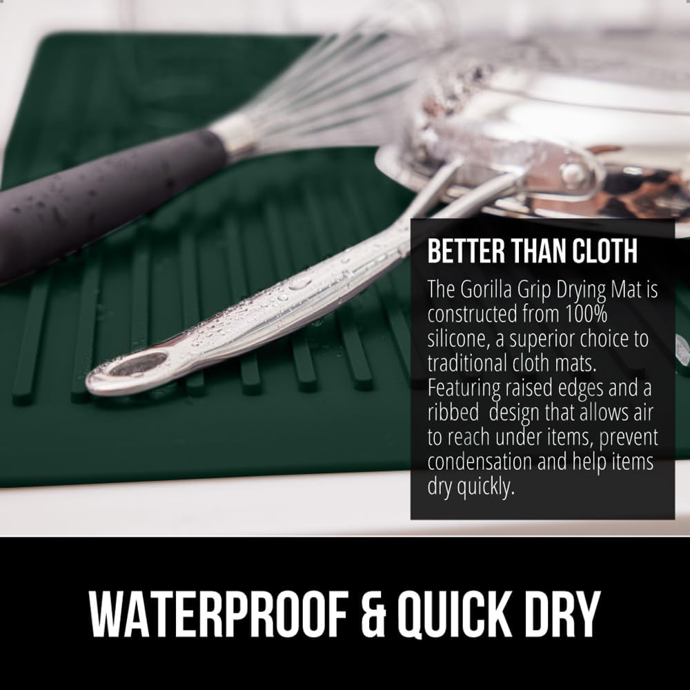 GORILLA GRIP 100% BPA-Free Silicone Dish Drying Mat for Kitchen Counter, Quick Dry, Water Catching Ribbed Design, Easy Clean Waterproof Sink Liner, Heat Resistant, Fits Under Rack, 13x11, Hunter Green
