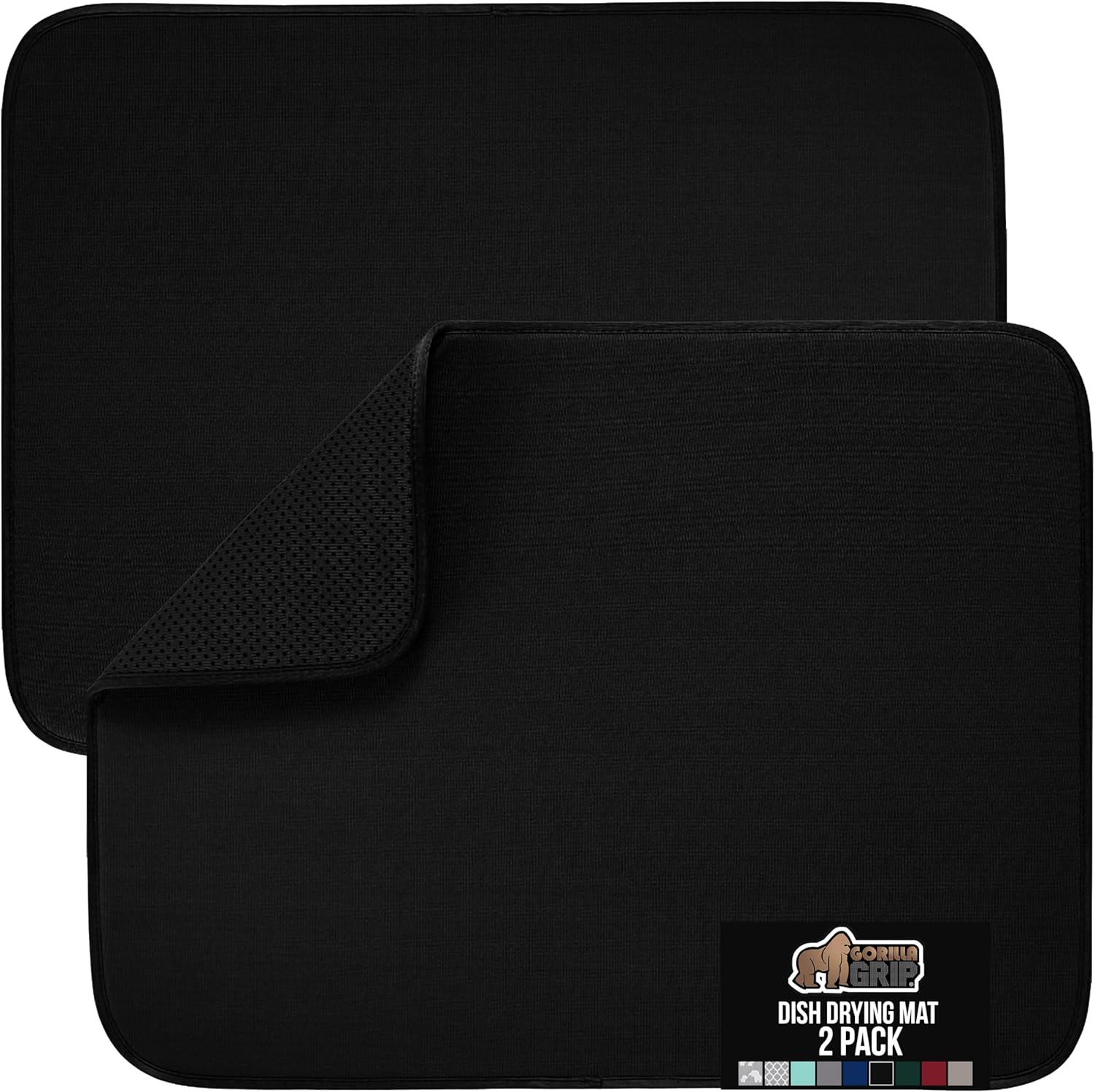 GORILLA GRIP Ultra Water Absorbent Microfiber Dish Drying Mat, Quick Dry Thick Mesh, Slip Resistant Pad for Sink Dishes or Under Rack, Kitchen Counter Accessories, 16x18, Machine Wash, 2 Pack Black