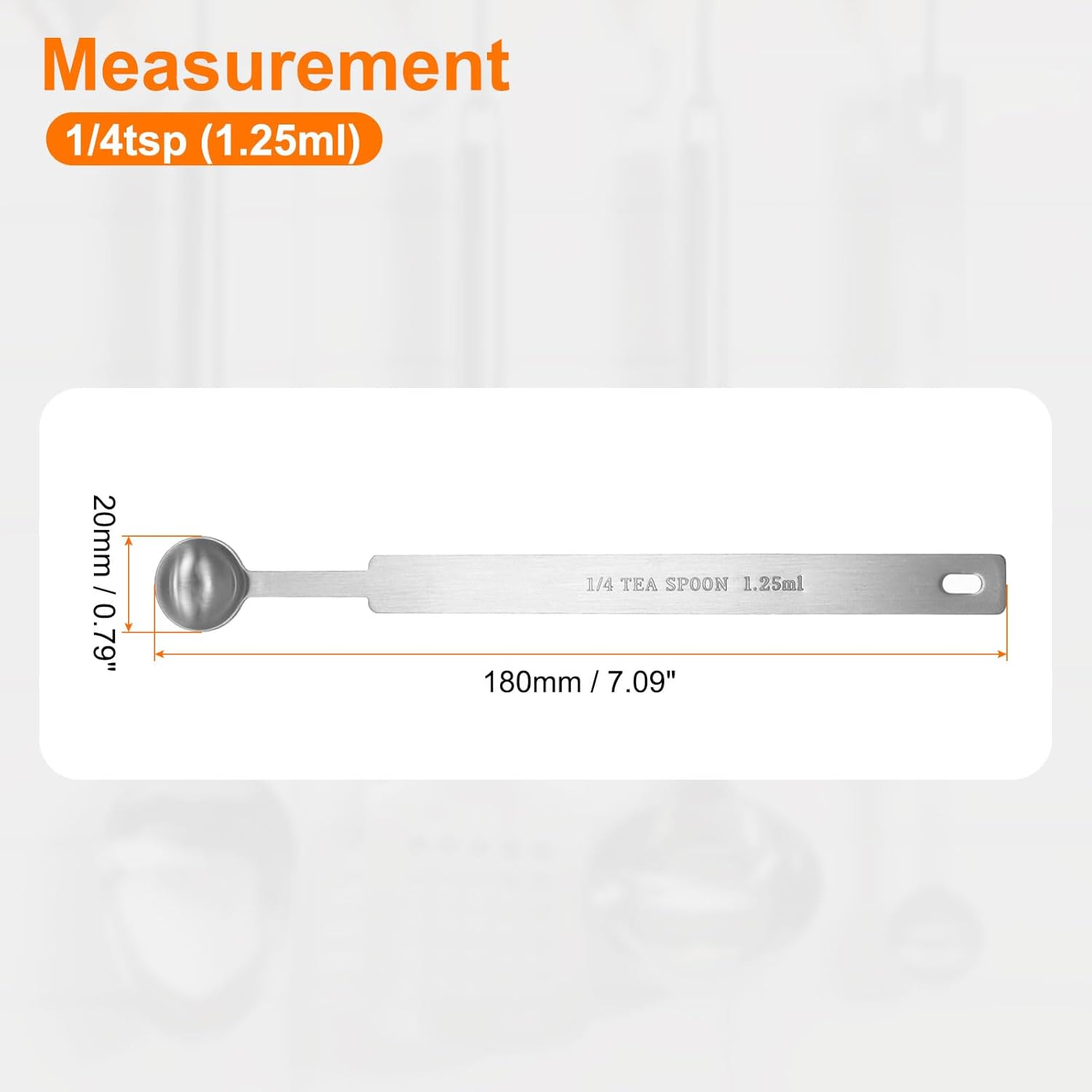 - Size - Each teaspoon is 1/4tsp | 1.25ml, and the total size is 180 x 20mm / 7.09 x 0.79 inch (L*W). The accurate measurement size is engraved on the handle of the teaspoon, which is easy to read, can effectively reduce measurement errors, and is durable.