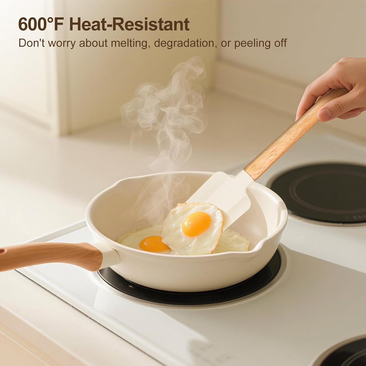 - 【Stylish & Functional Kitchen Essential】 Sleek off-white silicone head and natural wood handle combine modern elegance with practicality, 4 different sizes of spatulas to meet all your needs.