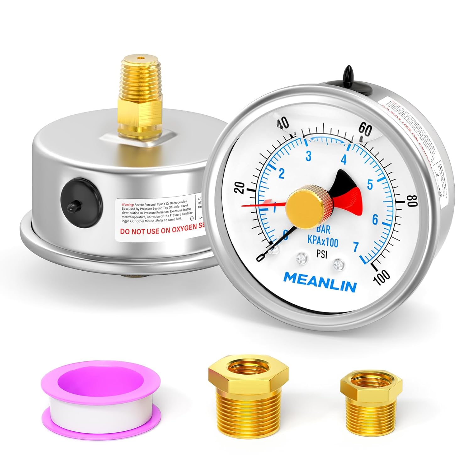 MEANLIN MEASURE 0~100Psi Stainless Steel 1/4" NPT 2.5" FACE DIAL with Reset Pointer Liquid Filled Pressure Gauge WOG Water Oil Air, Back Mount, with Brass Hex Bushing