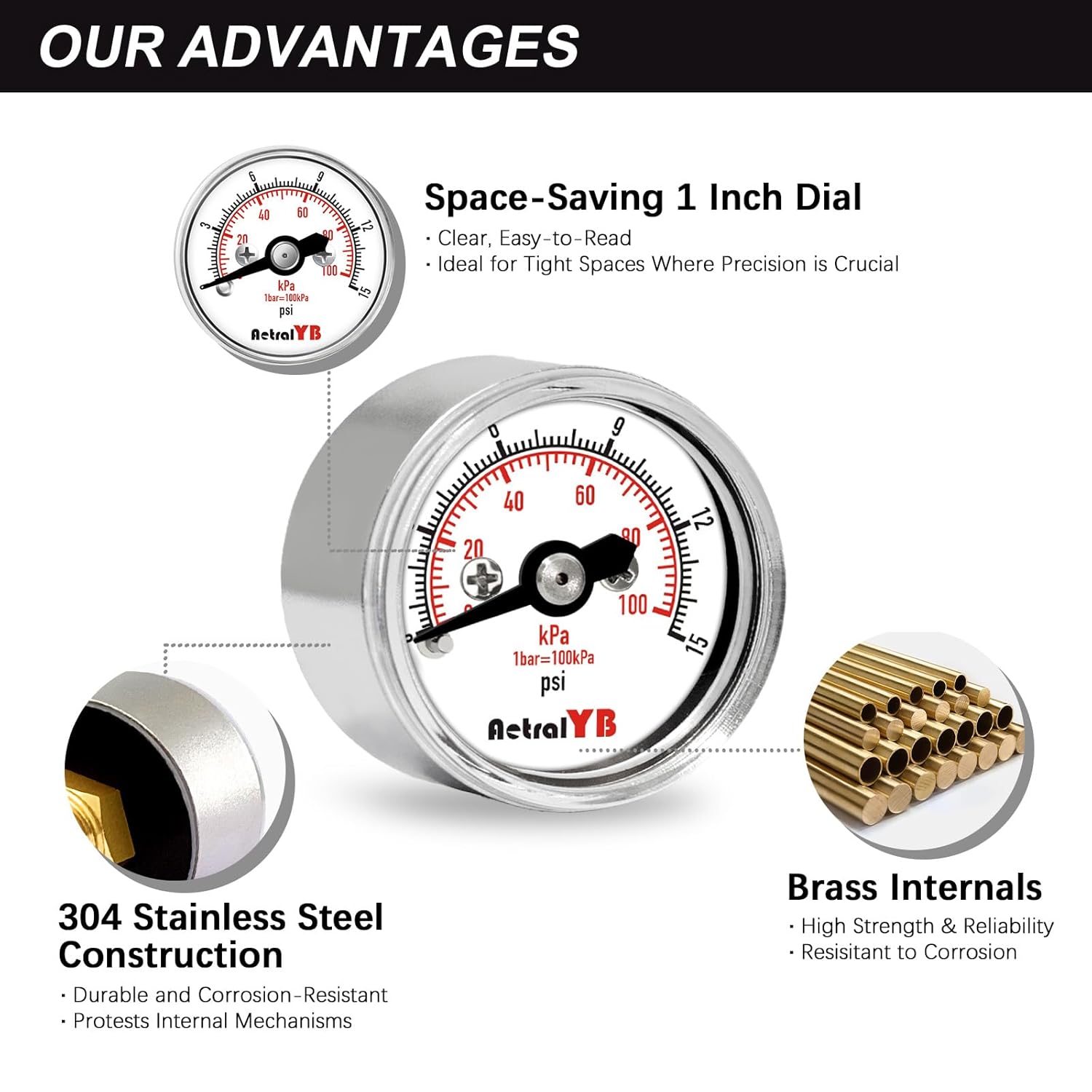 - STAINLESS STEEL BUILD: Built with a robust 304 stainless steel case and brass internals, this air pressure gauge is resistant to corrosion, providing long-lasting performance in harsh environments.