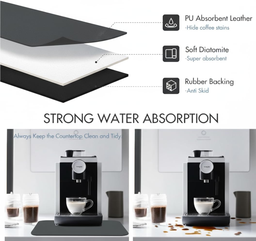 - COFFEE BAR MAT & COFFEE MACHINE ACCESSORIES – Keep your espresso station neat with this absorbent coffee bar mat, perfect for coffee makers, espresso machines, and pour-over setups. A must-have coffee station accessory and stylish coffee maker mat for countertops.