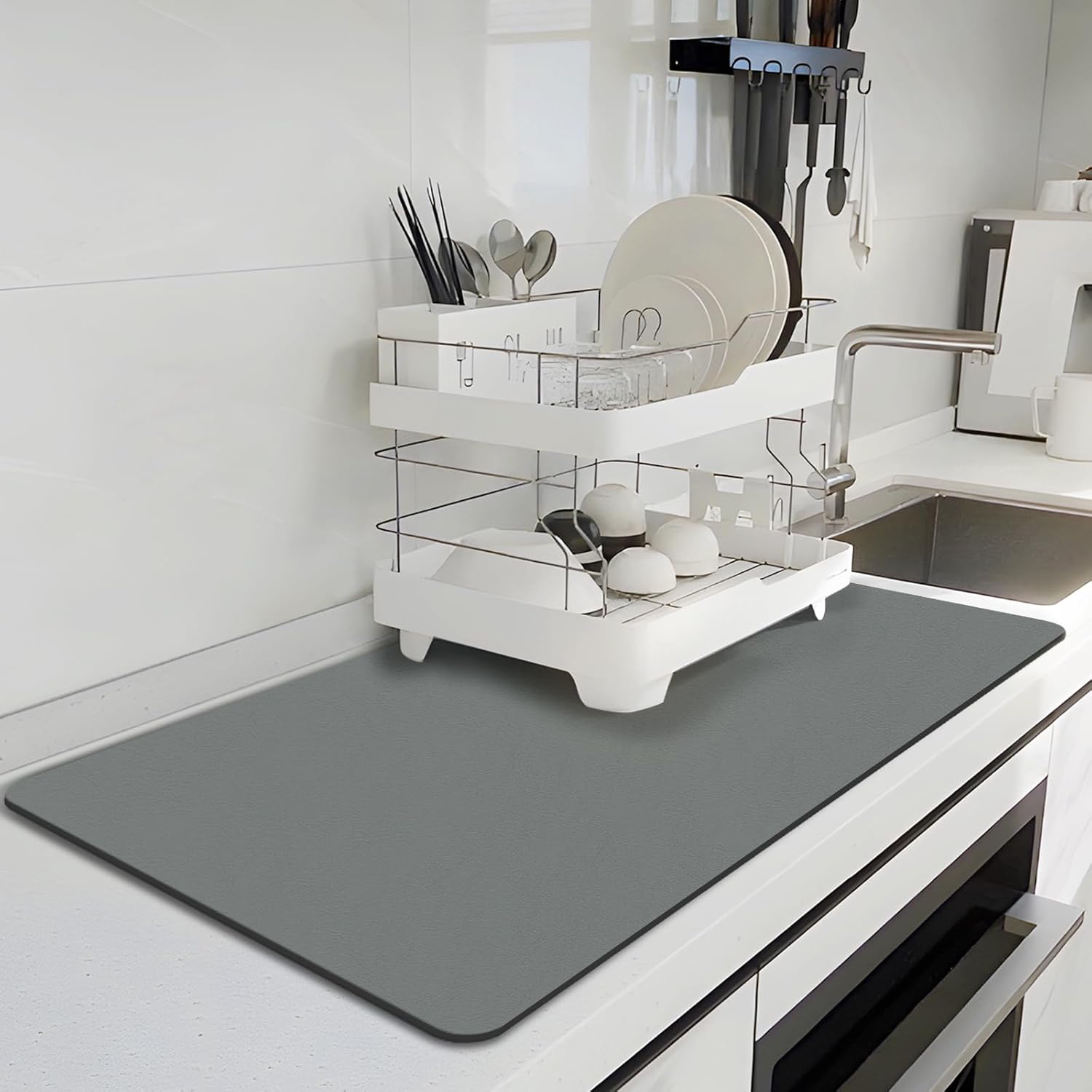 BLESWIN Dish Drying Mat for Kitchen, 15.7'' x 23.6'' Coffee Bar Mat for Countertops, Coffee Station Matt with Non-slip Rubber Backed, Absorbent Dish Dying Mat for Kitchen Counter, Gray