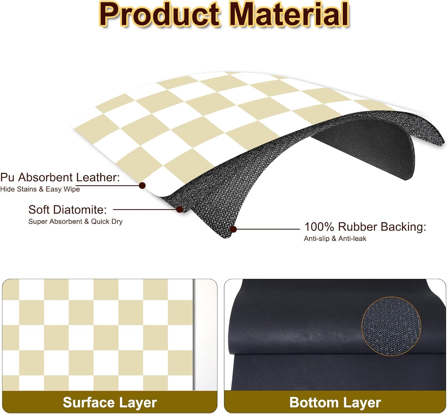 Dish Drying Mat for Kitchen, 15.7’’ X 17.7’’ Coffee Bar Mats for Countertop Fit Under Coffee Maker, Checkered Drying Mat, Hide Stain Rubber Backed Espresso Machine Absorbent Drying Pad, Beige & White