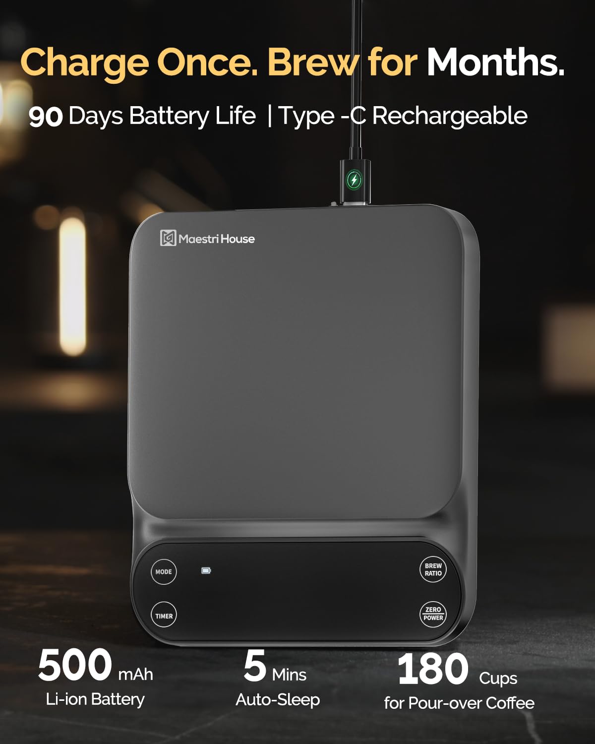 - 【Charge Once, Brew for Months】Stay eco-friendly and efficient with the built-in 500mAh lithium battery, offering up to 90 days of use on a single USB-C charge. This rechargeable espresso scale eliminates disposable batteries, keeping your coffee station clean, clutter-free, and ready for your next brew