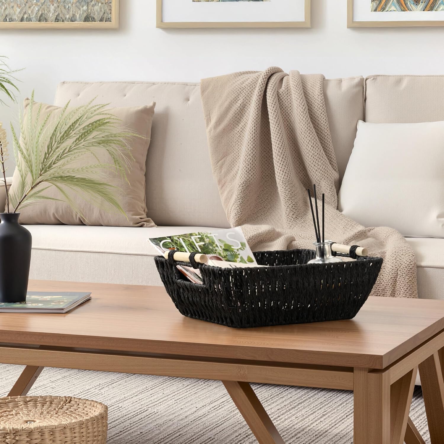 - Decorative Baskets: With its minimalist design, this woven basket adds warmth and style to any space. Ideal for the living room, bathroom, or bedroom, it keeps your items organized while enhancing your home’s aesthetic.