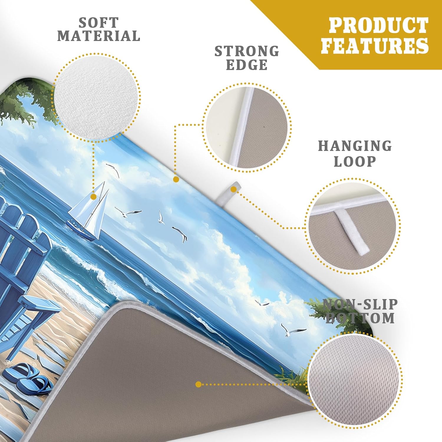 - 【Premium Material】The sea beach kitchen mat is made of high-quality polyester surface material, and the middle is composite sponge material, provides a soft protective cushion. The backing with reversible superfine fiber can absorb water several times heavier than itself, which quickly absorbs water, stops liquids from soaking through, keep the kitchen countertop dry and clean. The dish drying mat can been double-sided uses with strong edging, not easy to disperse.