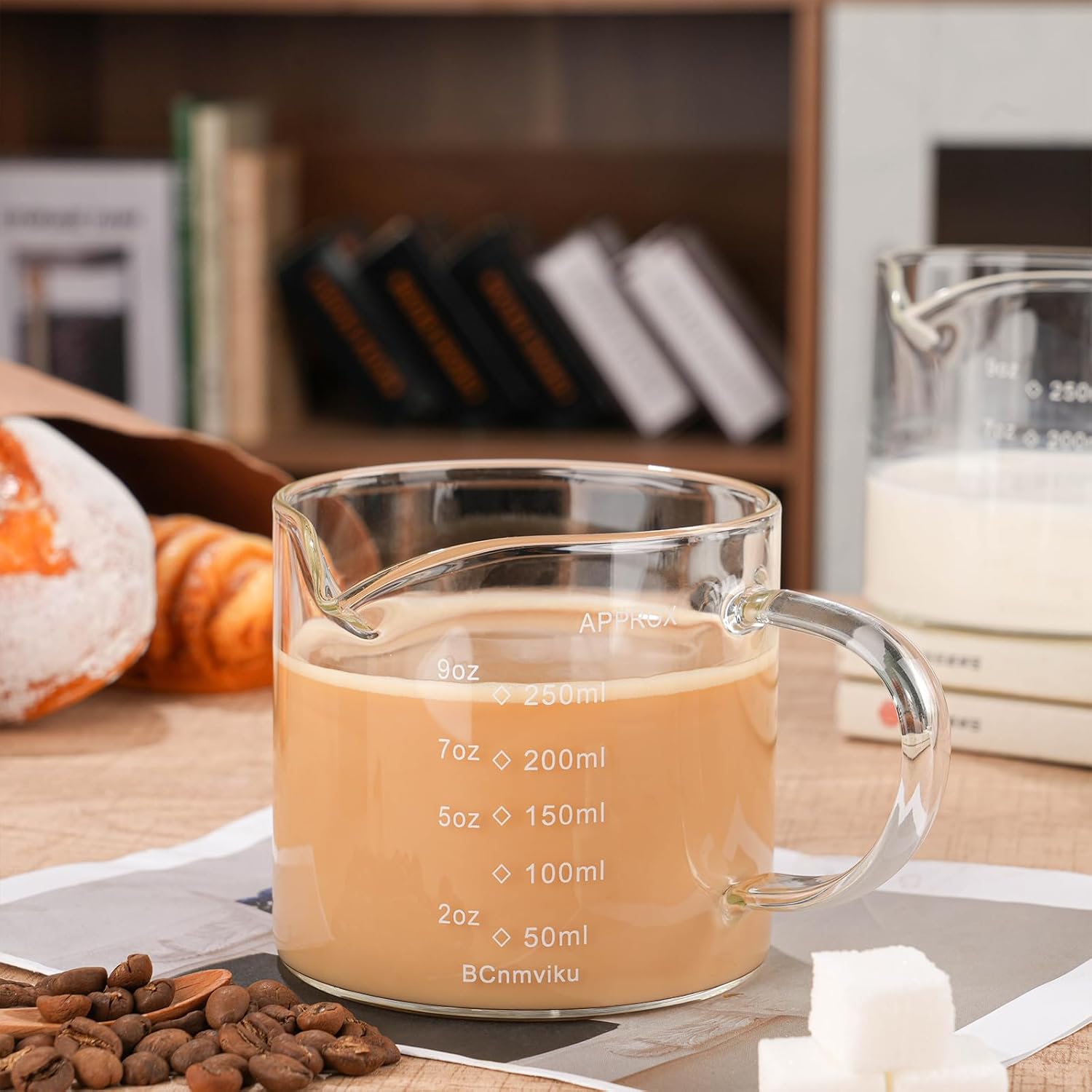 - The V-shaped drainage nozzle is more convenient to pour and not easy to leak. So glass measuring cup can pour smoothly without staining the tabletop and it is a good helper for your coffee.