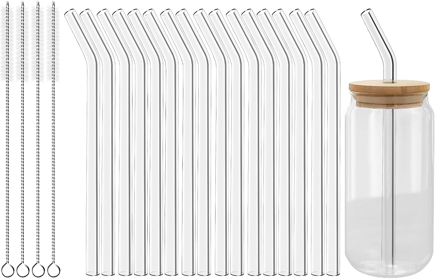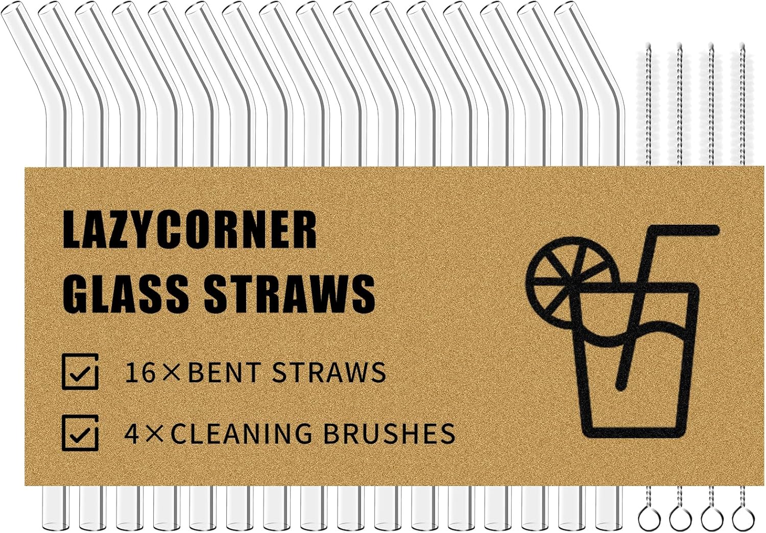 Lazycorner Reusable Glass Straws Set 16 Pcs 8.5''x 10MM Bent Clear Glass Drinking Straws, Set of 16 Bent with 4 Cleaning Brushes. Reusable Straws Perfect For Smoothies, Tea, Juice-Clear Cocktail.