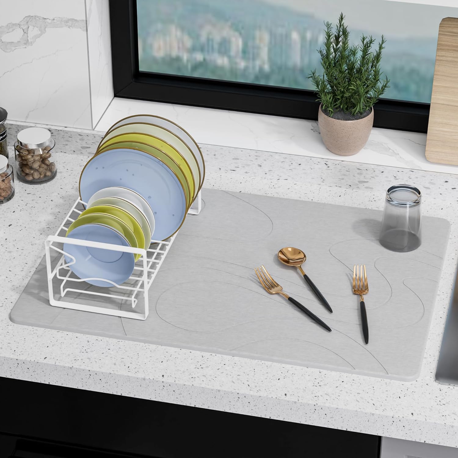 - [ECO-CONSCIOUS KITCHEN ESSENTIAL]: The stone drying mat for kitchen counter handcrafted with non-toxic diatomaceous earth and upcycled paper, designed for health-conscious homes. Drying matt kitchen counter combines sustainable with water-absorbing functionality, wrapped in minimalist aesthetics that align with your health life.