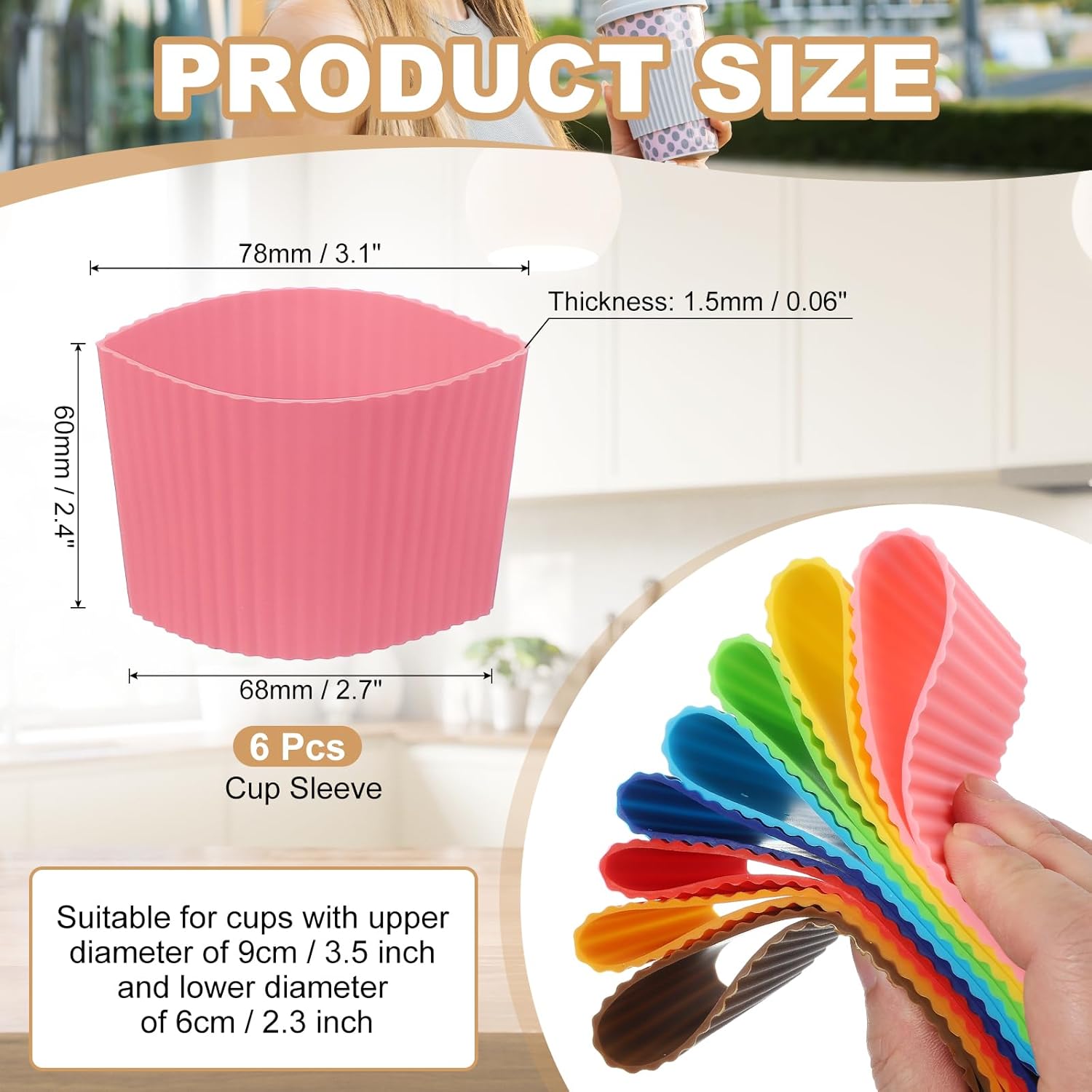 - Specification: Color: Dark Pink; Material: Silicone; Style: Tapered Stripes; High: 60mm / 2.4 inch; Upper Diameter: 78mm / 3.1 inch; Lower Diameter: 68mm / 2.7 inch; Thickness: 1.5mm / 0.06 inch; Applicable Cup Upper Diameter: 9cm / 3.5 inch; Applicable Cup Lower Diameter: 6cm / 2.4 inch; Package Contents: 6 x Cup Sleeve