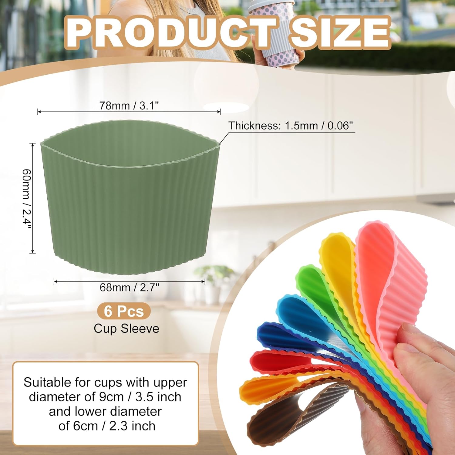 - Specification: Color: Avocado Green; Material: Silicone; Style: Tapered Stripes; High: 60mm / 2.4 inch; Upper Diameter: 78mm / 3.1 inch; Lower Diameter: 68mm / 2.7 inch; Thickness: 1.5mm / 0.06 inch; Applicable Cup Upper Diameter: 9cm / 3.5 inch; Applicable Cup Lower Diameter: 6cm / 2.4 inch; Package Contents: 6 x Cup Sleeve