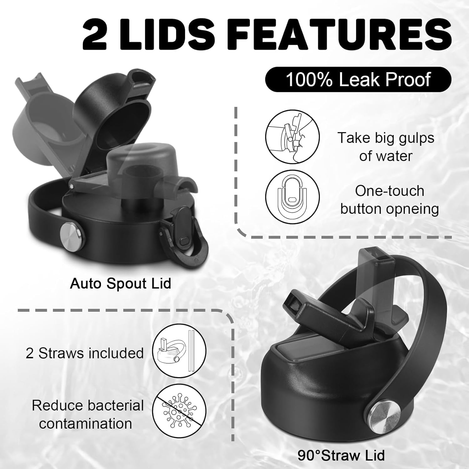 - 【2 LEAK-PROOF LIDS】ABOTOCUP insulated water bottle provide a different drinking experience with two lids that are fully leak-proof and designed for effortless drinking. Easy to use one-handed or hands-free drinking even when you're busy. Perfect for all indoor and outdoor activities.