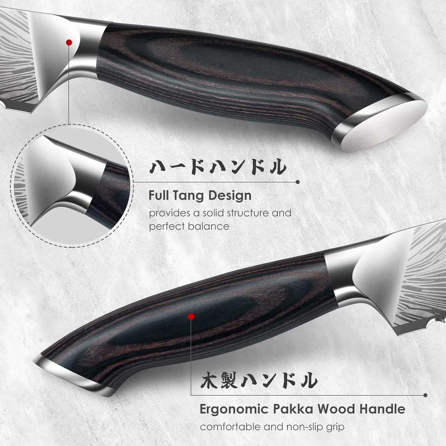 - [Fashion Laser Engraved Pattern] This professional sourdough slicing knife features a design that combines traditional aesthetics with modern elements. Engraving a stylish texture pattern on the blade's surface by laser makes the highest rated bread knife look more advanced and fashional. NOTE: THIS IS NOT DAMASCUS KITCHEN KNIFE