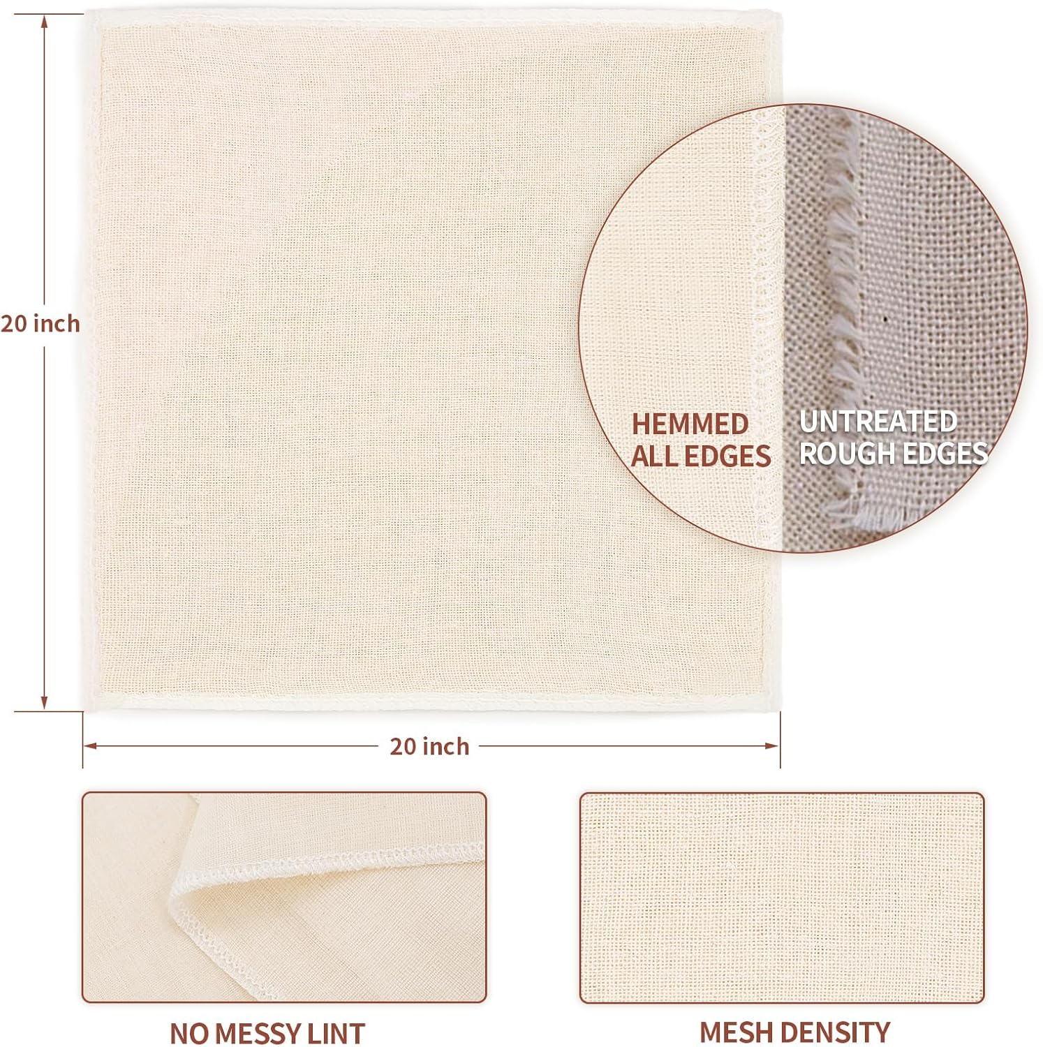 - 【Technical Specifications】Dimensions: 20"x20" (51x51cm) | Thread Count: 56x42 | Weight: 600GSM | Package: 20PCS cheese cloths + shrink packing.