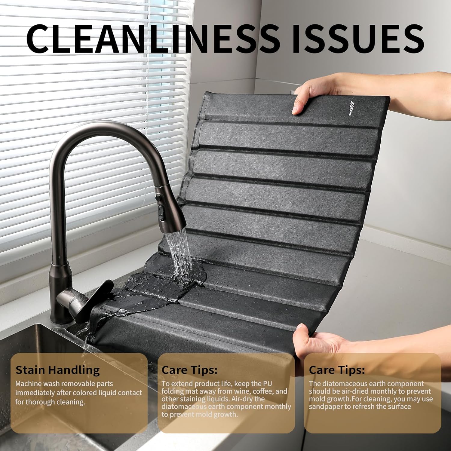 - 【FOLDABLE STONE DISH DRYING MAT】This 24"×16" stone drying mat fits dishes, pans, and more. Easily folded or rolled for compact storage. Remove the diatomaceous earth strips or fold to fit any kitchen space.