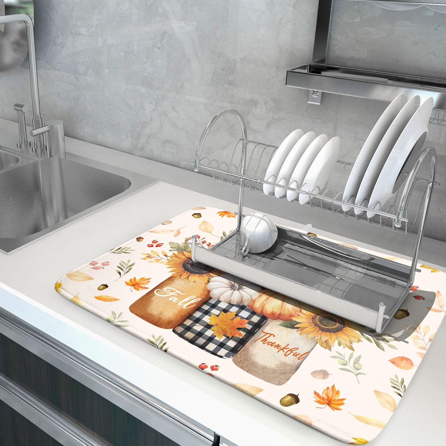 Autumn Sunflowers Vase Dish Drying Mat for Kitchen Counter,Fall Pumpkin Maple Leaves Drying Mat 18 x 24 Inch with High Absorbent Microfiber Dish Drying Drainer Mat for Coffee Bar