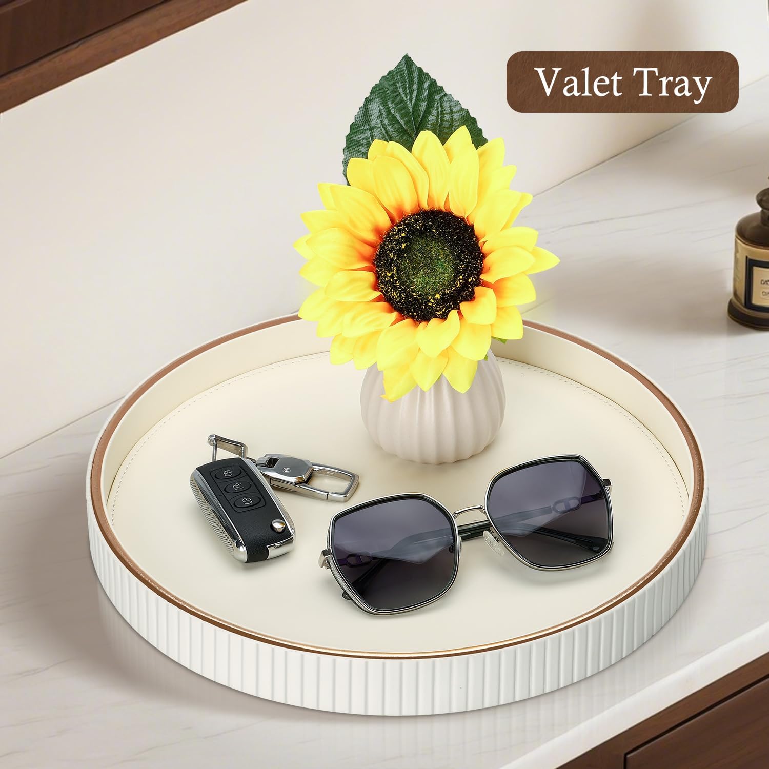 GORESE Round Decorative Serving Tray for Coffee Table Decor, 12" PU Leather Table Centerpiece Home Decor, Valet Tray for Trinket Jewelry Perfume Key, Ottoman Tray Nightstand Organizer, Cream White