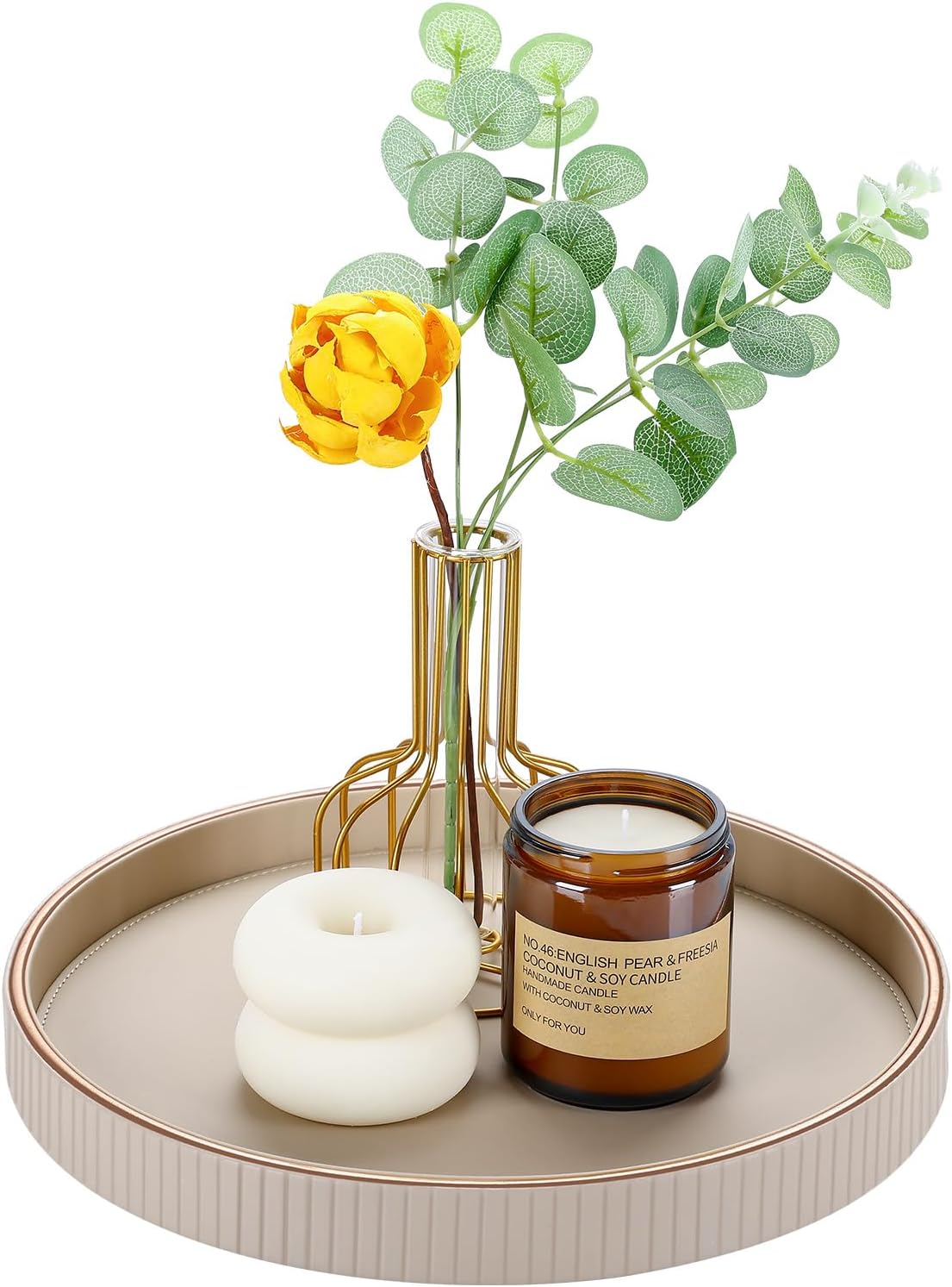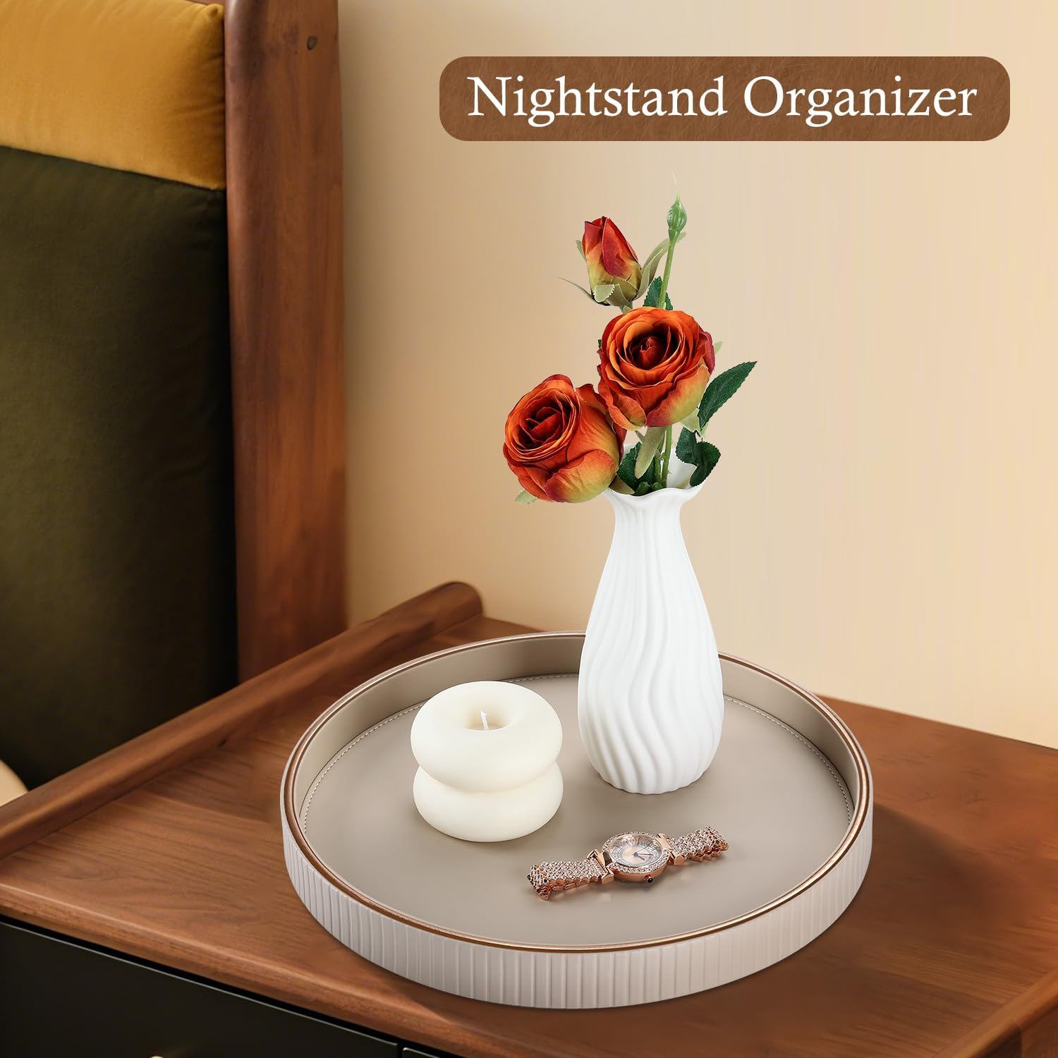 GORESE Round Decorative Tray for Coffee Table Decor, 12" PU Leather Serving tray Table Centerpiece Home Decor, Desk Valet Tray for Trinket Jewelry Perfume Key, Ottoman Tray Nightstand Organizer, Biege