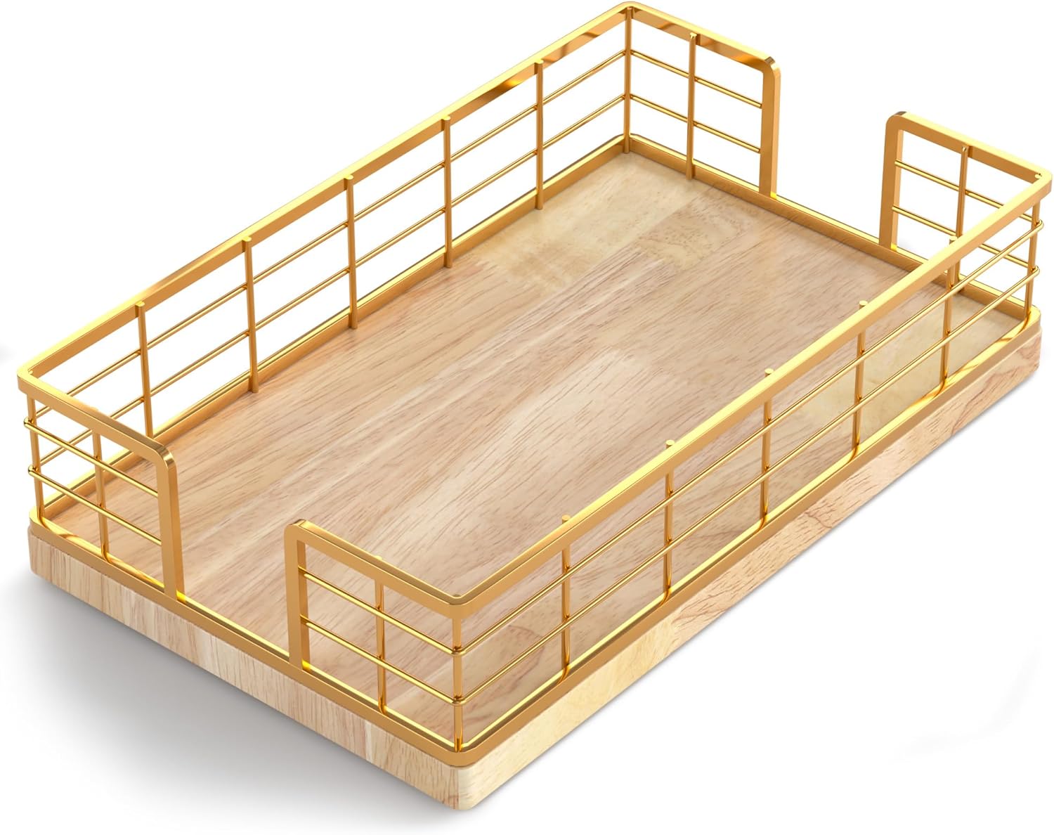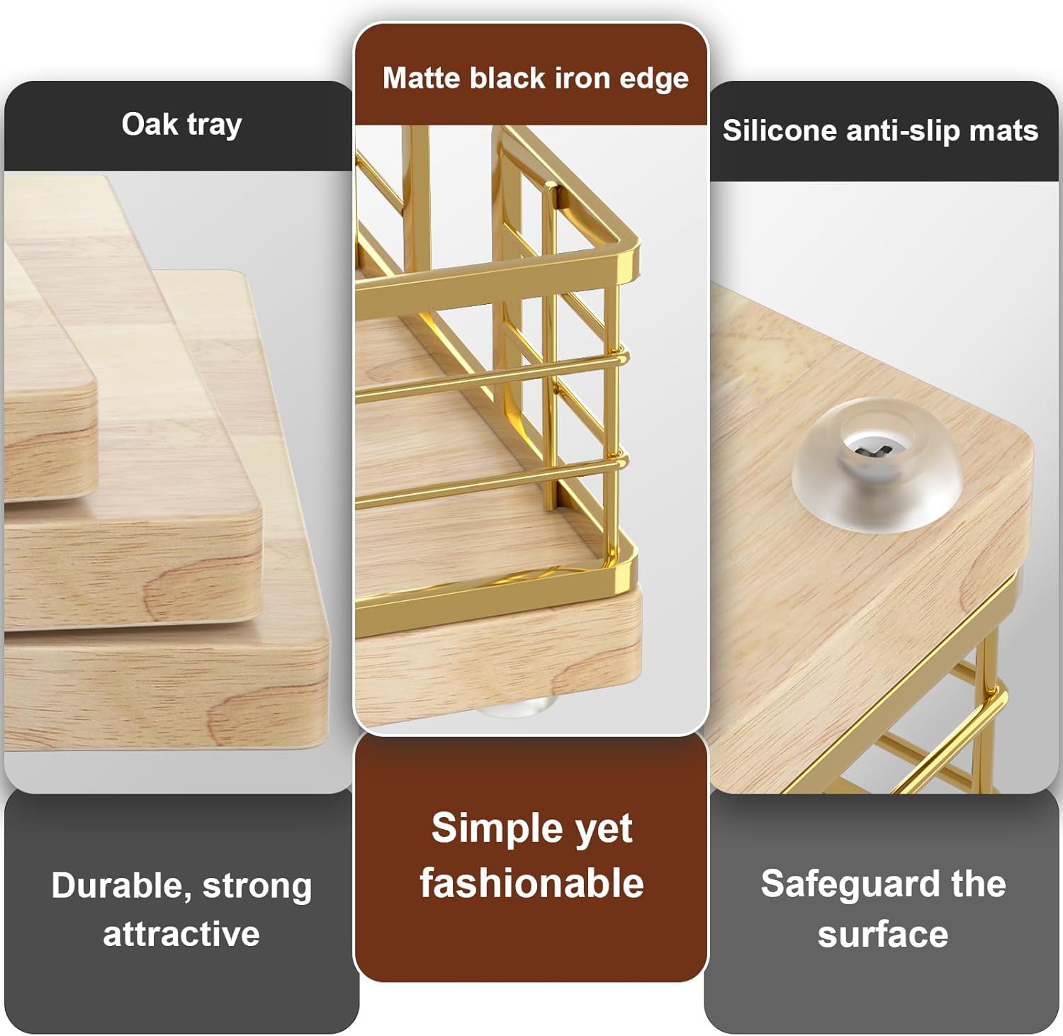 - Cost-effective: No assembly required, easy to clean. The tray crafted from iron and oak is simple and attractive. The solid bottom ensures items won't fall. With silicone non-slip pads, it provides both anti-slip functionality and better protection for surfaces