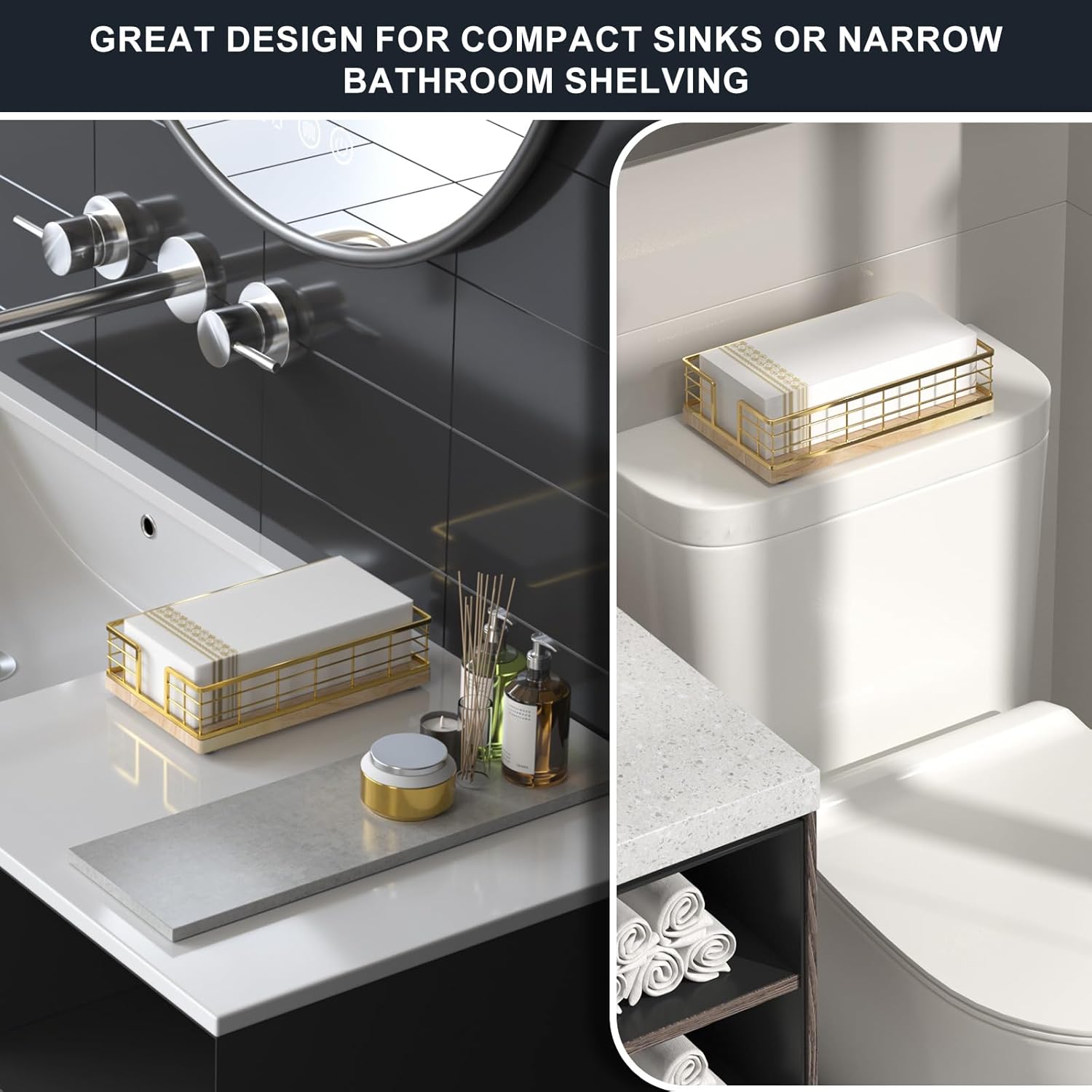 Wican Guest Towel Holder Tray for Bathroom, Oak and Iron Napkins Holder for Powder Room Dinning Table Wooden Basket for Disposable Paper Hand Towels Gold and Oak