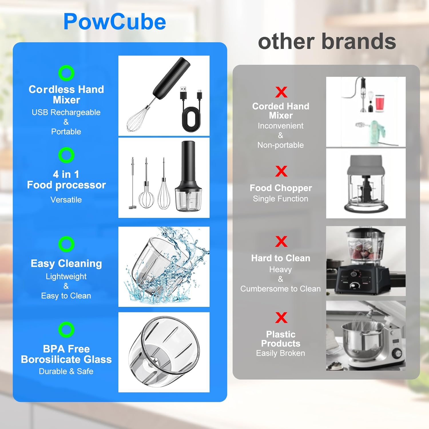 - USB Rechargeable & Portable: PowCube handheld mixer electric features a 2000mAh lithium battery. Fully charged, this milk frother and hand mixer powers up to 40 uses and includes an auto shut-off after 3 minutes of continuous use to prevent overheating. It can be easily restarted by pressing the power button for 2 seconds. Perfect as a mixer for frothing milk, chopping vegetables, or whipping cream, this cordless hand mixer is not suitable for mixing heavy batter such as cookie dough. Enjoy mixing anywhere, anytime!