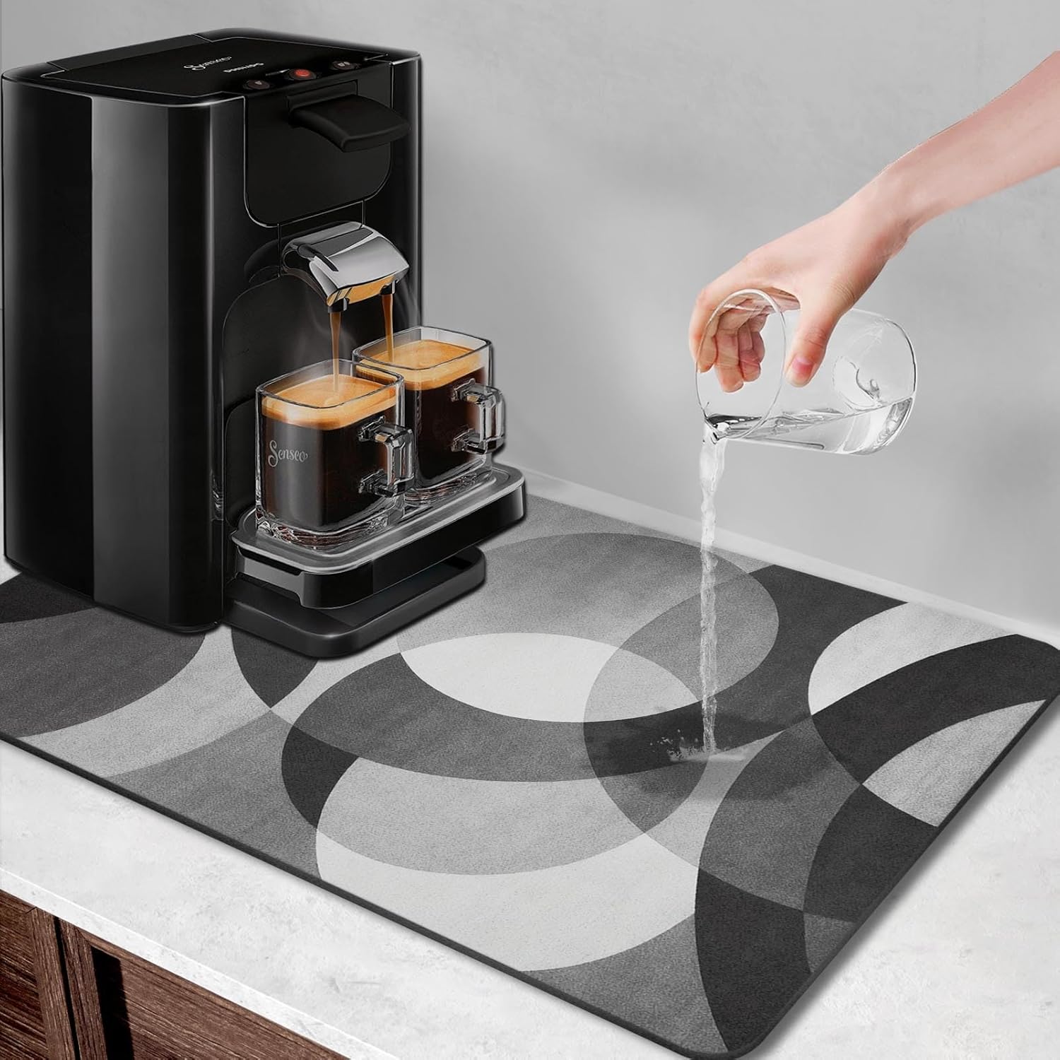 - [Multi-Purpose] This coffee mat is not only as coffee station accessories, but also great for dish drying matfor kitchen countertop, cups, water dispensers, mixers, ice cream machines, dish washing racks, dinner plates, tableware.Also can be used as pet feeding mat, under sink mat, door mat or placemat.So it's the perfect coffee accessories for apartment must haves.