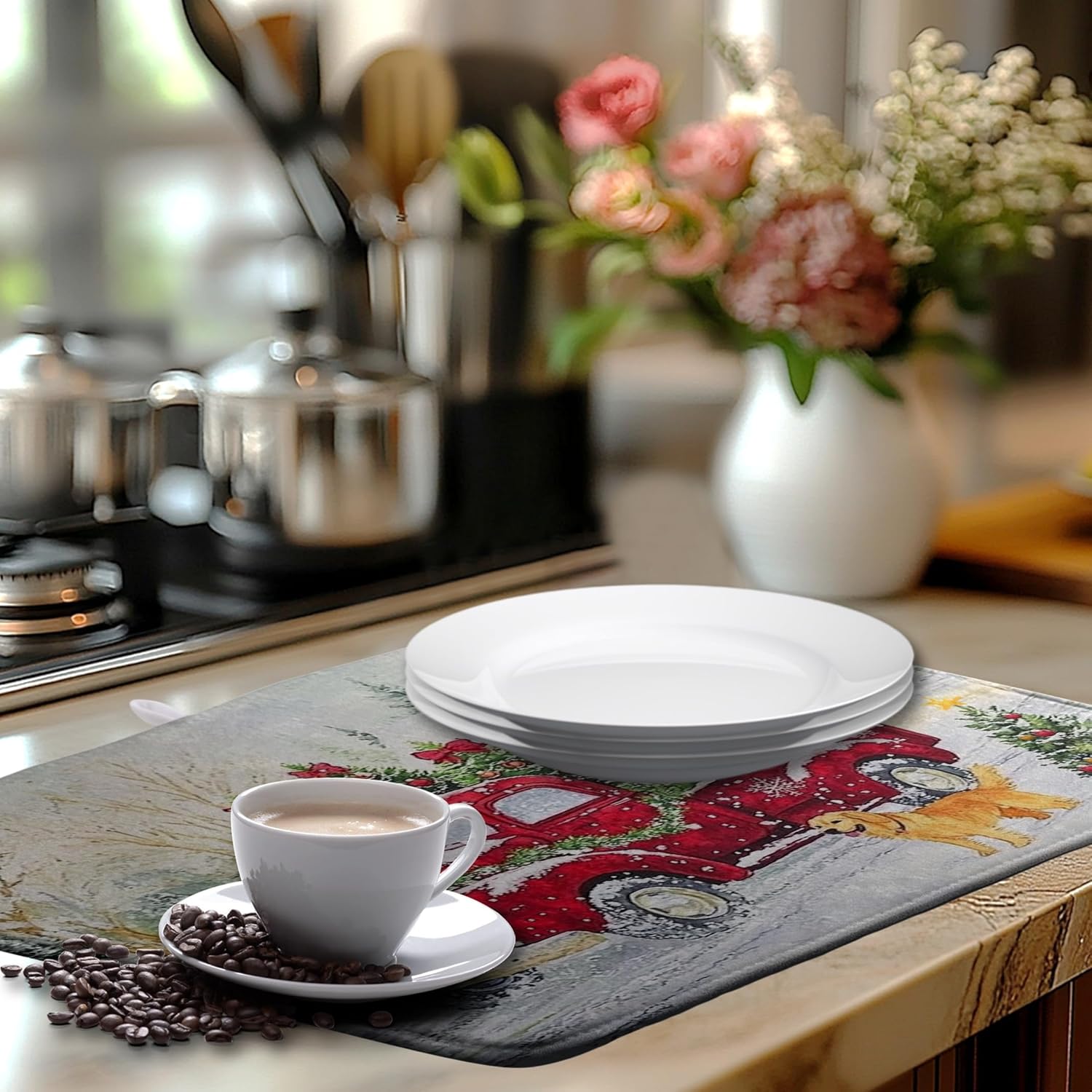 - [Quick Absorption]: Made of absorbent material, our Winter Snowflake Christmas dish drying mat Red Truck Large kitchen mat dog dish dryer mat for kitchen absorbs water stains quickly, keeping your table top dry and clean, avoiding water stains and leaks, providing you with a pleasant and dry dining or working experience.