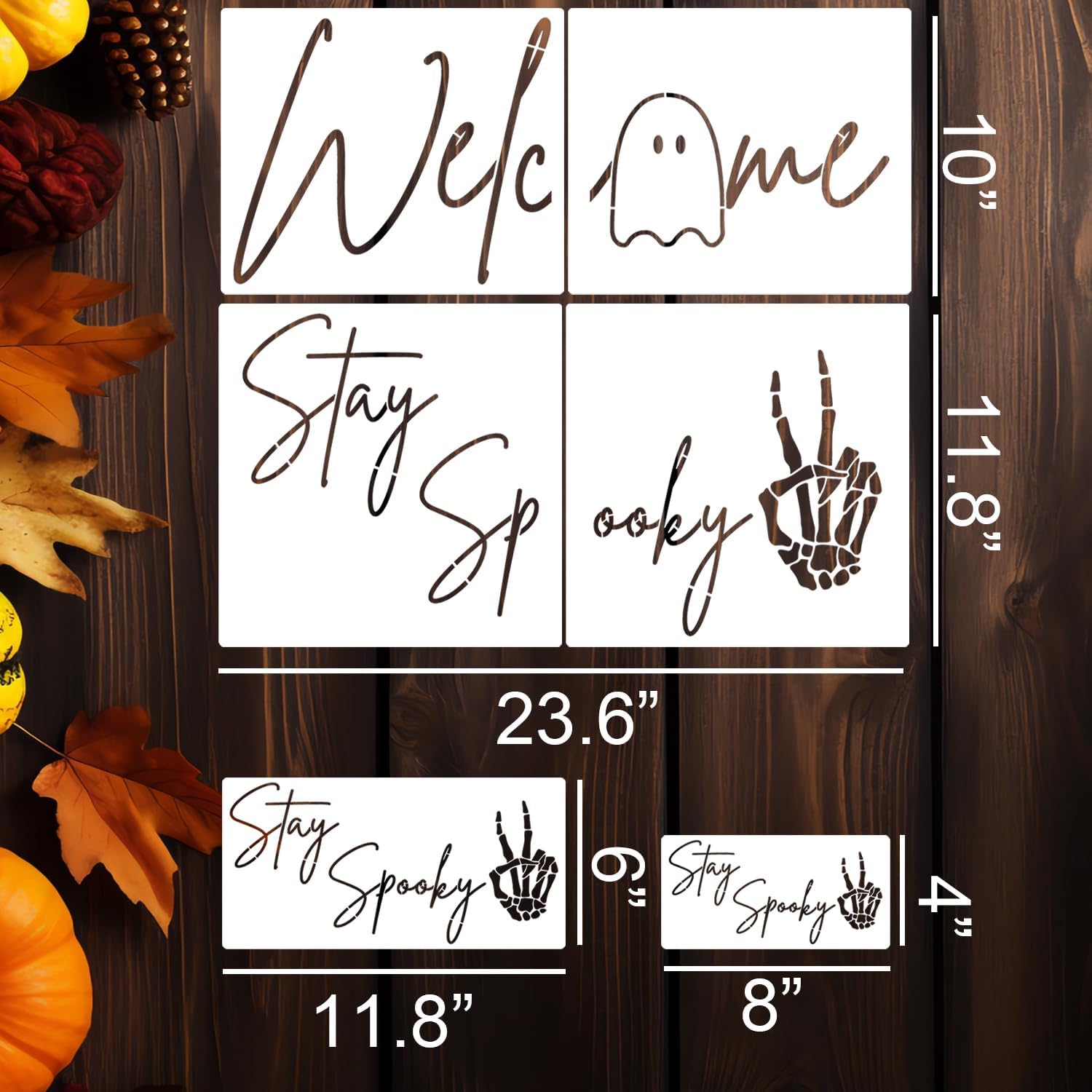 Halloween Stencils for Door Mats Welcome Ghost Stencil Reusable Stay Spooky Halloween Stencils for Painting on Wood Sign Doormats Fabrics DIY Crafts Decor