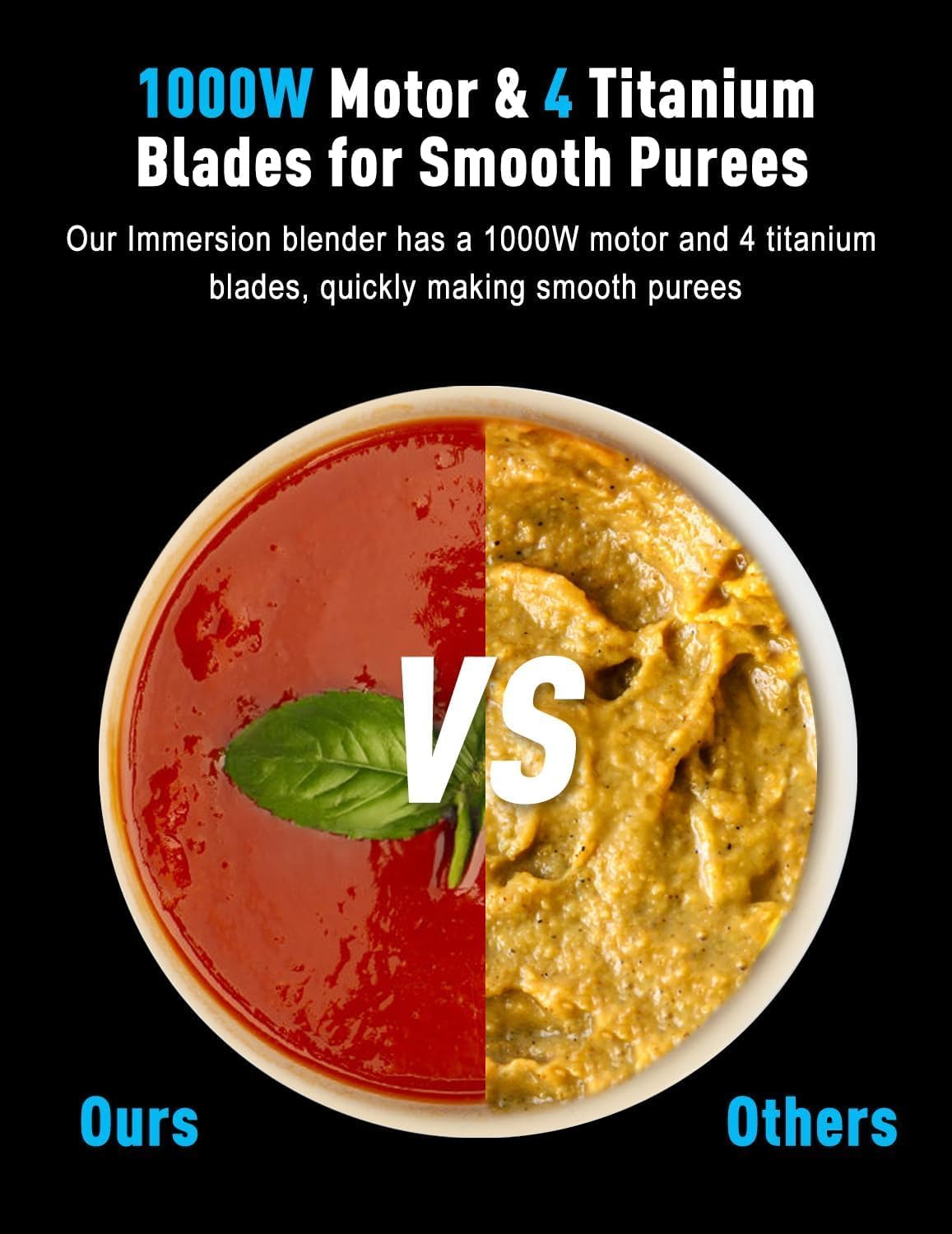 - ă4-Blade Titanium HeadăOur immersion blender features a 4-blade titanium head for superior performance. Compared to standard 2-blade designs, it blends more efficiently, This cutting-edge design not only improves blending efficiency but also extends the lifespan of the blades, making it a reliable choice for all your culinary needs.